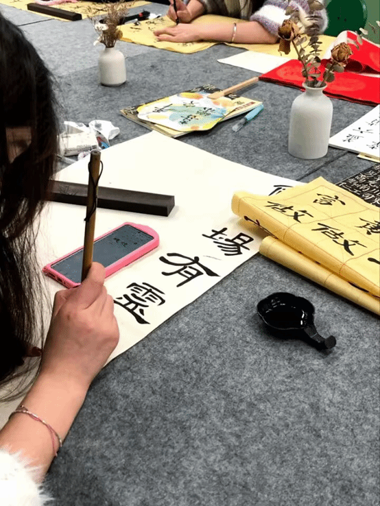 这次书法体验课让同学们临摹书法家的作品,感受书法家们的笔酣墨饱,欣赏了行云流水,落笔如云烟的大家字体,领略到了那云鹤游天,群鸿戏海的书法魅力。书法作为一种修身养性的方式,通过练习书法可以帮助同学们培养沉稳自律的性格和耐心的品质。书法之美,不仅是一场视觉上的盛宴,也是一场与心灵的对话。当凝视书法作品时,会感受到一种超越语言的沟通,一种韵律的共振,一种思想的呼应。它不仅仅是一种文字的艺术,更是一种精神的寄托和释放。与书法对话,可以领略到深沉的意境、丰富的思想以及灵动的美感。书法之美如同一曲抒情的乐章,让同学们在文字的世界中找到心灵的栖息之所。