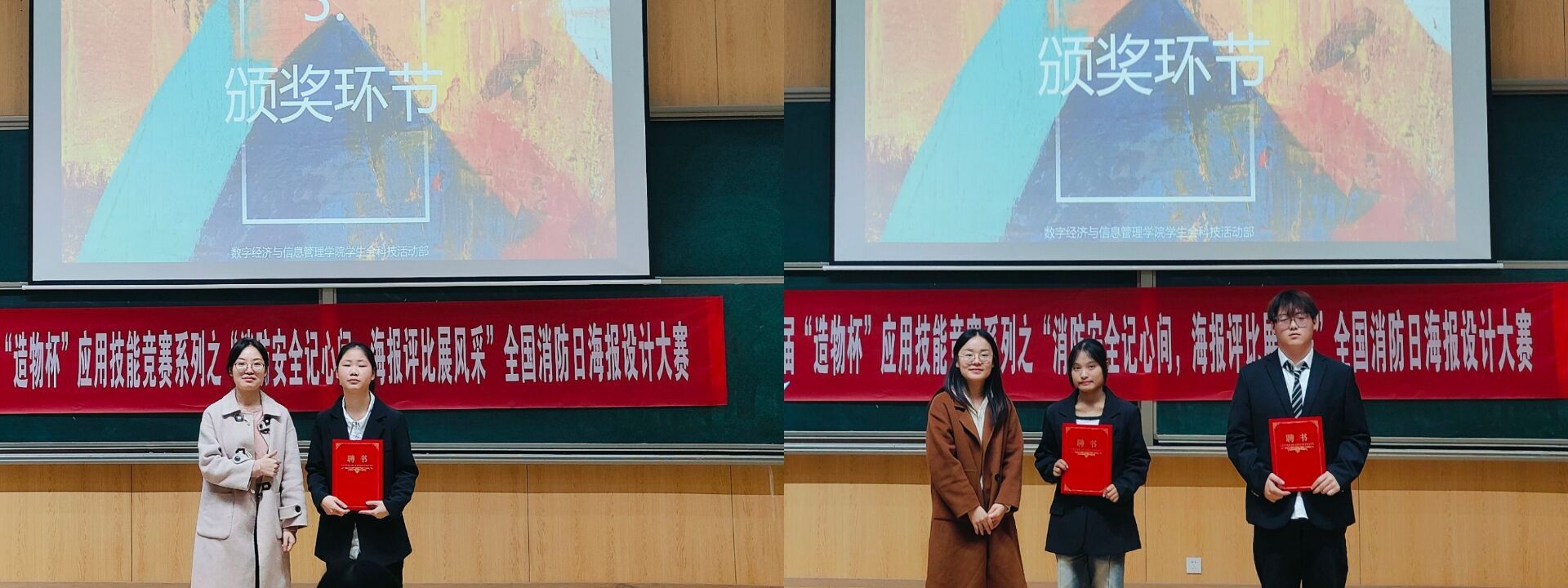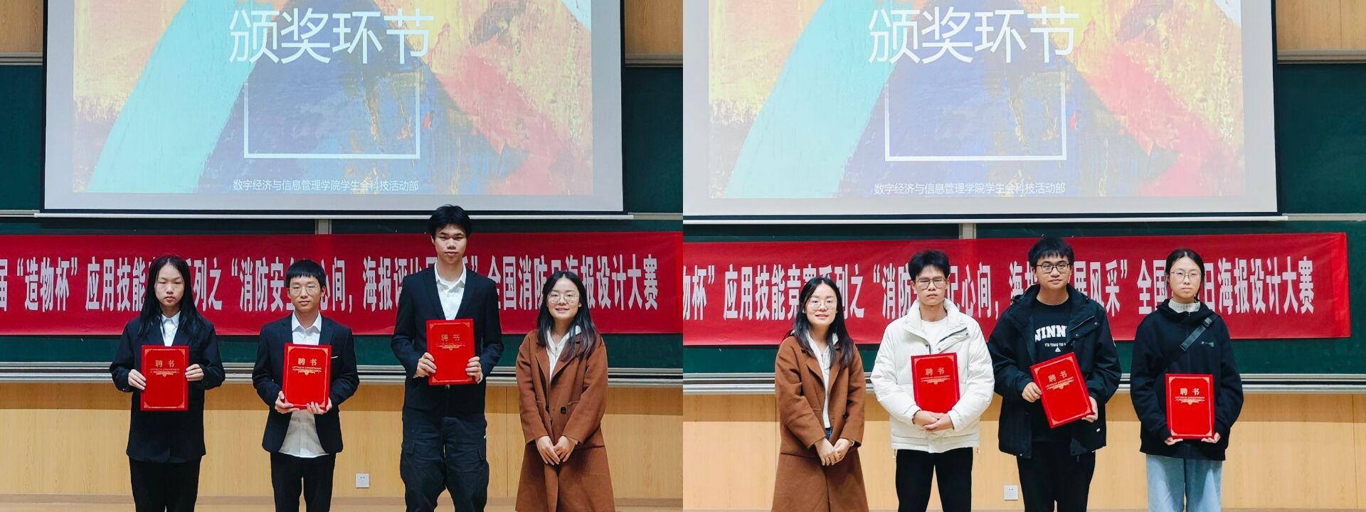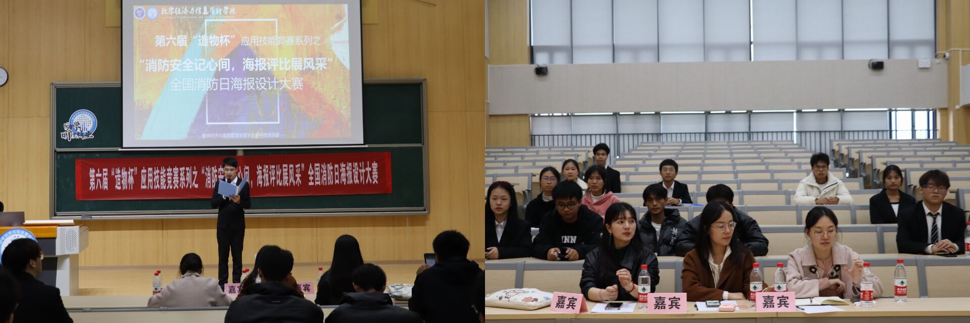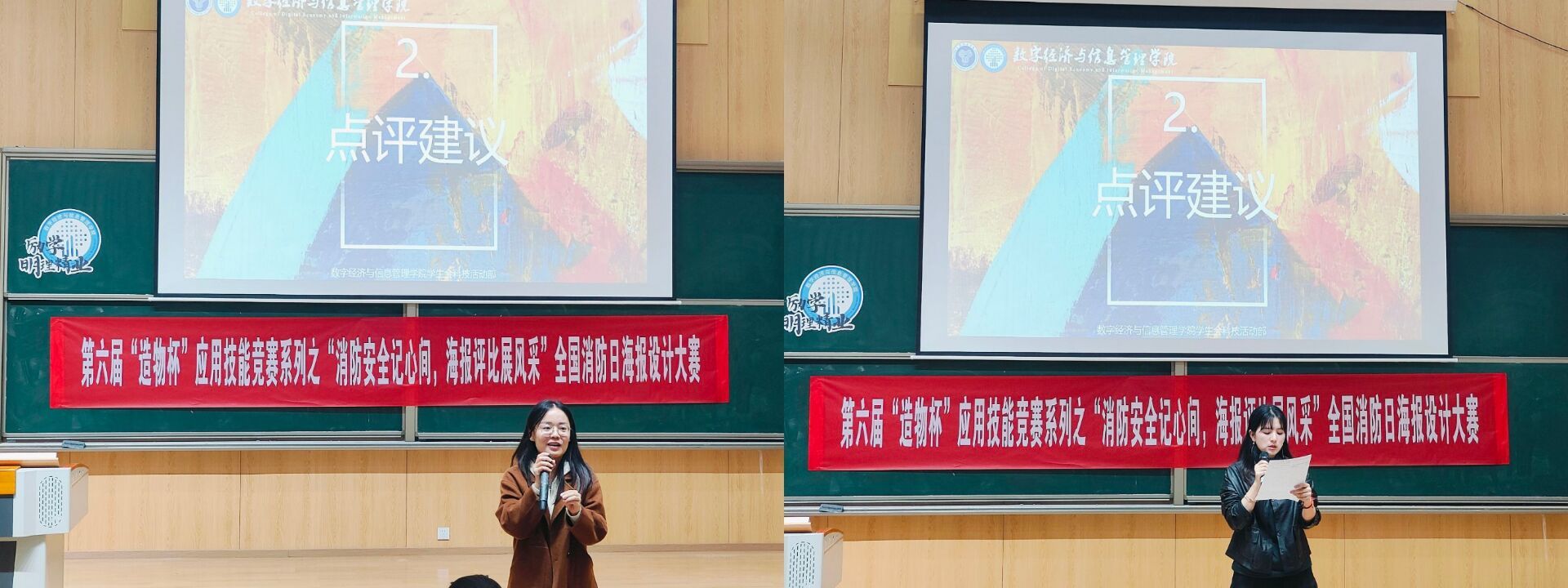 为加强消防安全意识的普及,培养大家对火灾事故的预防和自救能力。同时通过海报的形式,将消防安全知识生动、直观地传递给学生,增强同学们对消防安全的认识和重视程度。数字经济与信息管理学院特此举办第六届“造物杯”应用技能竞赛系列之“消防安全记心间,海报评比展风采”全国消防日海报设计大赛,并于2023年11月24日在玉棠书院阶梯教室成功开展。本次比赛有幸邀请到数字经济与信息管理学院宣传板块指导老师田园园、志愿服务板块指导老师张静、社团活动板块指导老师周静作为评委嘉宾出席。
