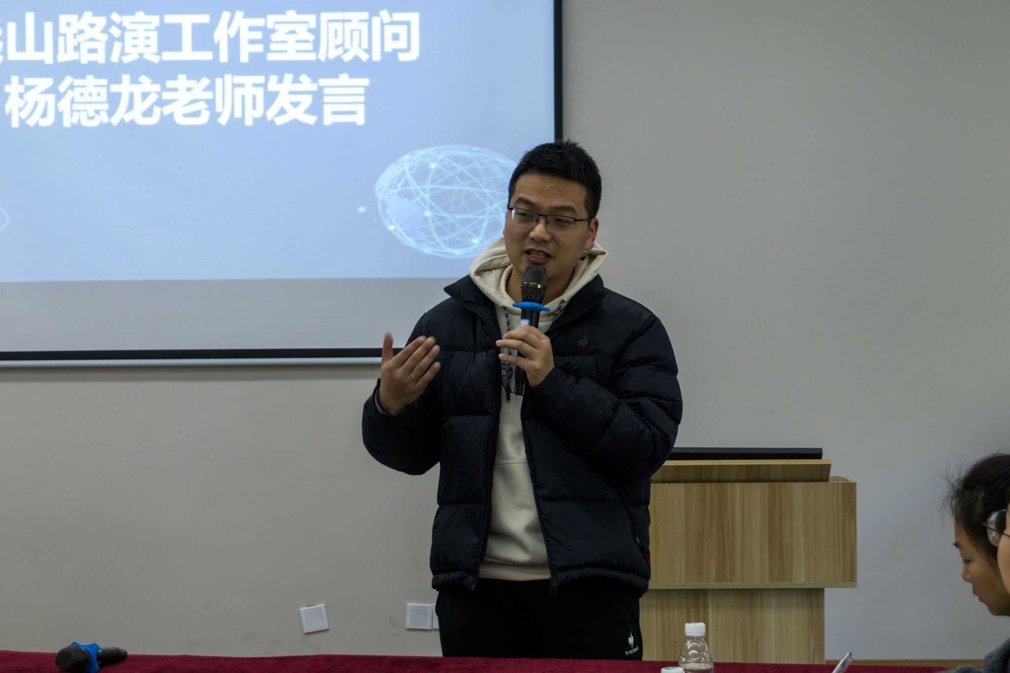 随后,就业创业指导与服务中心主任助理杨德龙老师代表校就业创业指导与服务中心对工作室的成立表示祝贺并给予厚望,并且今后也会向工作室投入更多的精力与资源,希望远山路演工作室能多开展培训和活动,为参加创新创业比赛的学生提供学习交流的平台。