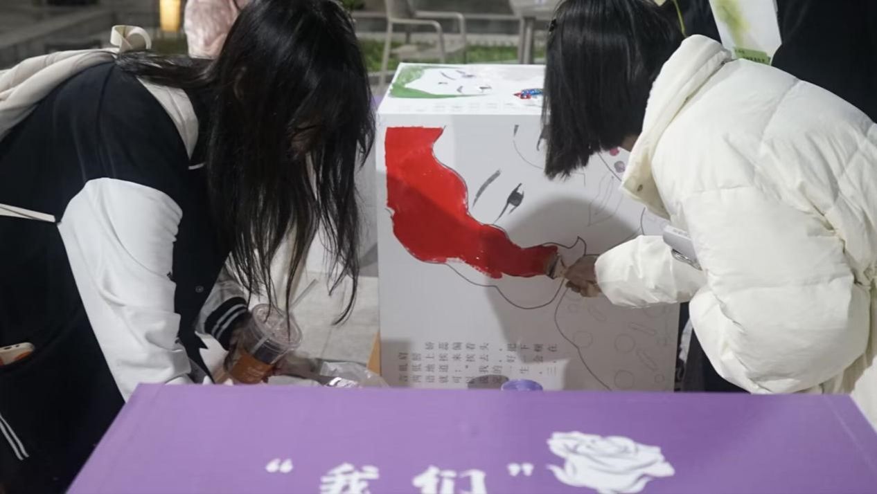 活动正式开始,成群的同学涌入活动现场,在工作人员的有序引导下,来到玫绘艺术装置。在活动负责人廖杨简单围绕主题讲述“红玫瑰与白玫瑰”的故事情节后,同学们依照心中的理解和想法,大胆表达,细心地为装置上色。其中有位同学用色极为大胆,黑中加绿,填满绅士的头发部分,现场工作人员采访道:“为什么如此创新?”“我的色彩参杂我的情感,渣男头顶一片绿。”这位同学幽默诙谐地回答。玫绘艺术装置成为观云书院的中庭一道靓丽的风景。