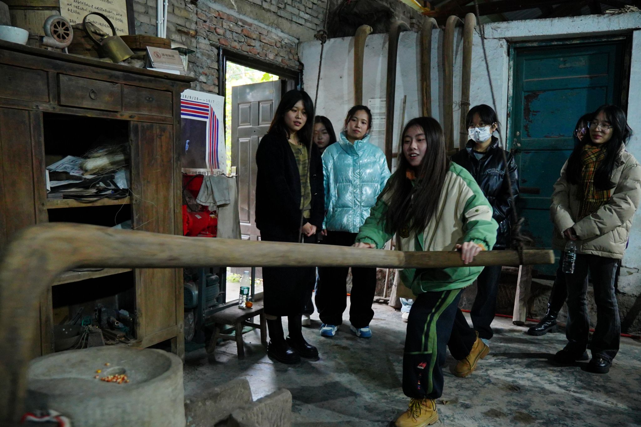 稍作休整后,刘馆长带领同学们进入农业生活馆,让每个同学尝试亲手用石磨磨玉米面,在刘馆长的示范下,许多同学跃跃欲试,在刘刚馆长的耐心指导下成功完成了这次特别的体验,在每个同学都以为这一流程已经结束的时候,刘馆长搬开石磨的上层,用刷子细致地扫下残余的玉米面,与同学们强调要有始有终,要确保完全劳动的整个过程都完成,也要考虑下一次劳动以及下一位使用工具的人,同学们听后,纷纷表示自己也想要尝试清理,在多位同学们的仔细清扫下,本次考察活动也逐渐接近了尾声。