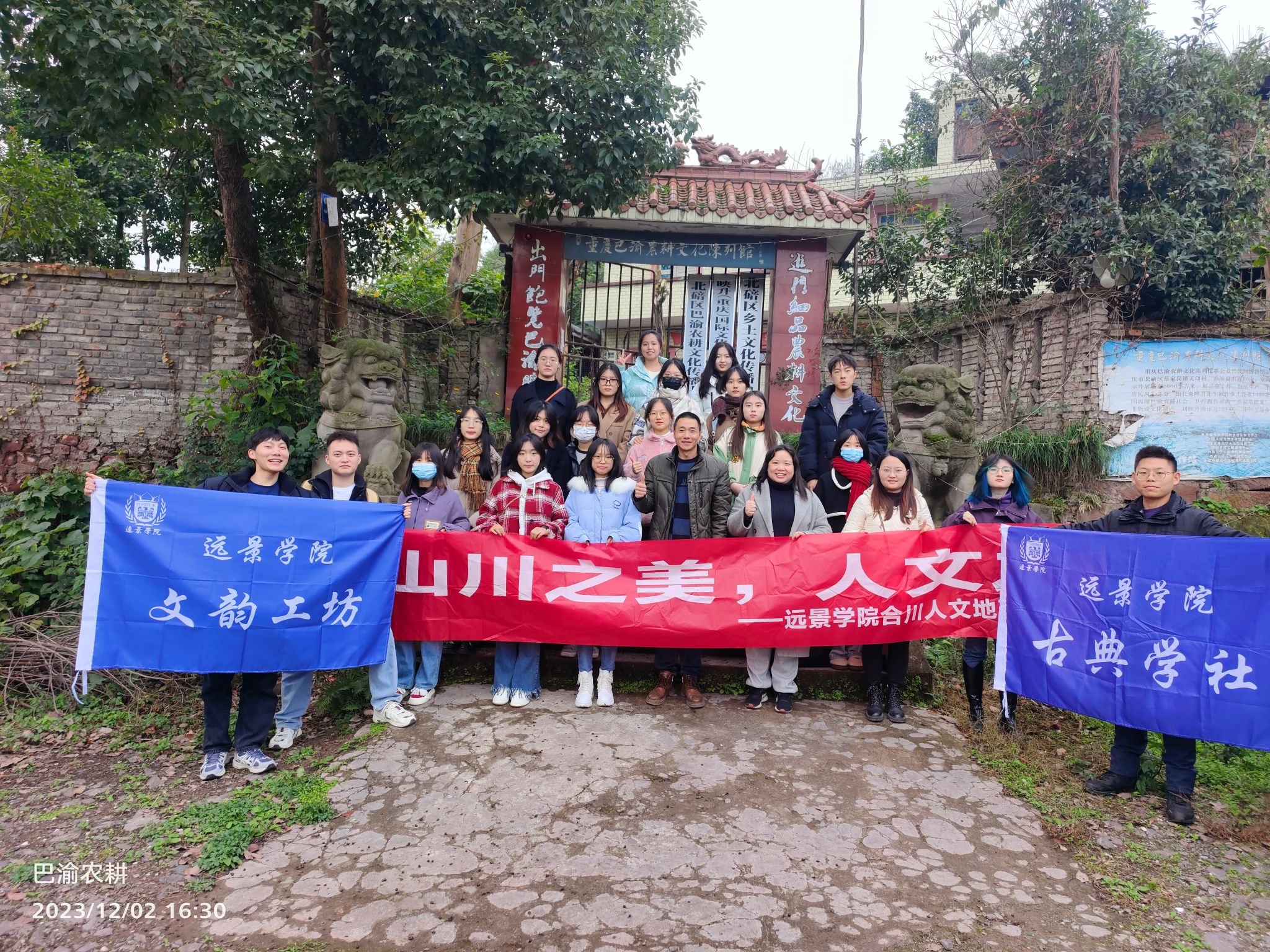 感受农耕文化,找寻中国人的根与魂。为让同学们切身体会中国农耕文明智慧,了解城市化过程中农村人的乡愁,文韵工坊、古典学社携远景劳动教育课程同学一同组织“巴渝农耕文化陈列馆考察活动”,由远景学院吴慈荷老师、淬炼商学院潘泉宏老师带领,于2023年12月2日赴北碚区蔡家巴渝农耕文化陈列馆进行参观与学习,巴渝农耕文化陈列馆刘刚馆长热情接待远景学院师生一行。