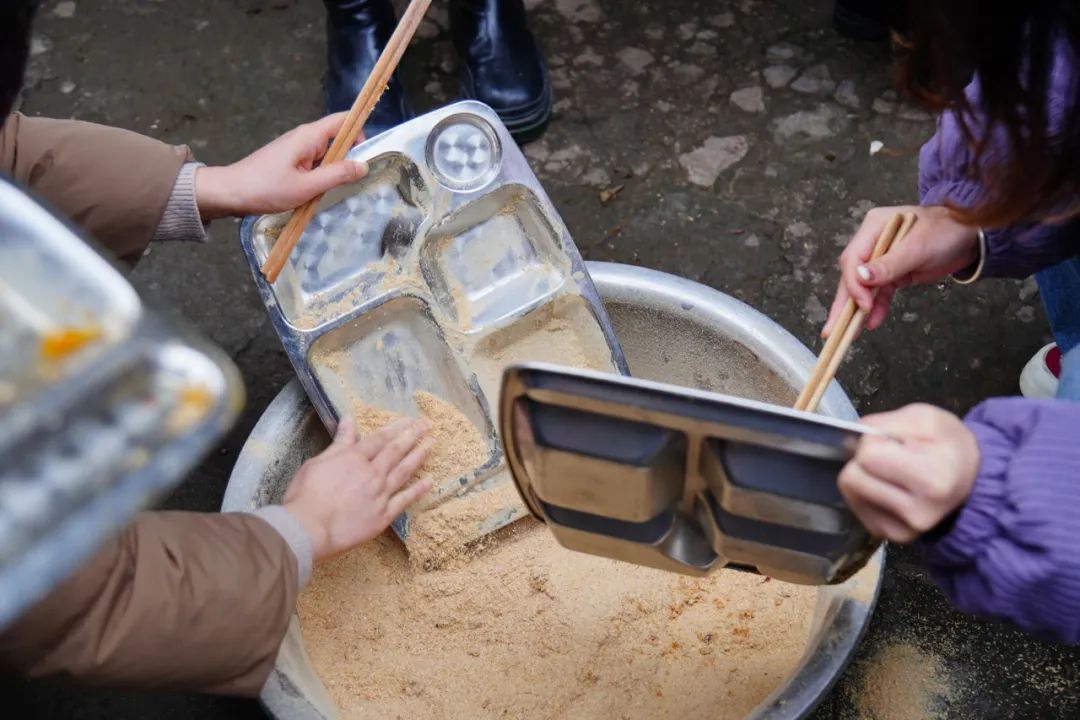 为进一步让同学们感受先辈们的劳动智慧,使每个同学切身参与其中,午饭期间,刘刚馆长鼓励大家尝试“米糠洗碗”,即利用米糠吸附油污的特性,用米糠反复摩擦碗筷,以达到为使用后的碗筷洗去油污的目的。第一次接触这种形式,同学们有些无措也有些新奇,怀揣着半信半疑的心情,动手利用米糠来清洗自己的碗筷,从刚开始的小心翼翼到最后成效显现的惊叹,同学们再一次被先辈的智慧所折服,过程中,吴慈荷老师说道:“同学们有没有什么不一样的感受呢?第一次洗碗没有用洗洁精,而是用大家手里的米糠。”同学们也逐渐从欢乐中回过神来,思考过程中的感悟与收获。