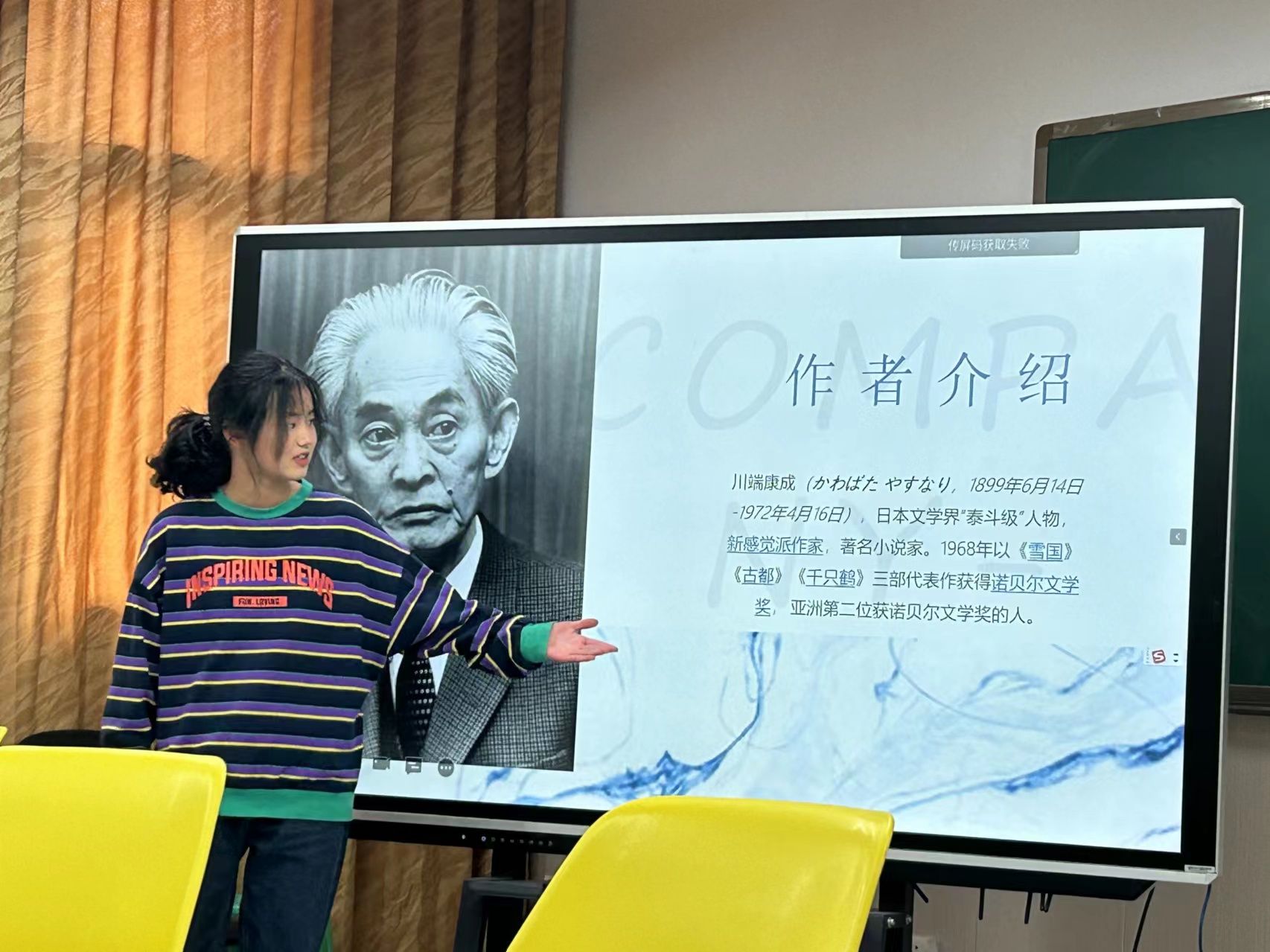 首先给我们带来分享的同学的是2023级的陈雯婧同学,她分享的书籍是川康端成的《雪国》,不同于《沁园春·雪》中“北国冰封,万里雪飘”的壮阔豪迈的雪景,川康端成笔下的雪景是充满着忧伤孤独的,这也恰恰暗示了主人公岛村和叶子还有驹子三人之间的悲伤故事。陈雯婧同学提到这本书自己读了很多遍才浅浅有了较深的理解,这也和我们大多数人读书的经历相似,一本好书会随着阅读的推移散发出更深更诱人的魅力,也正因为反复品鉴书籍让我们通过文学能够更了解到作者笔下的生活环境。最后陈雯婧同学以书中的“穿过县界长长的隧道,便是雪国夜空下一片白茫茫”祝愿同学们都能找到属于自己的那条人生路。