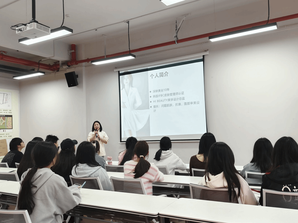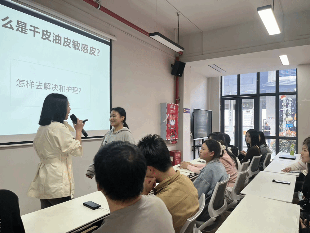 琪琪老师先带领同学们了解脸部皮肤的构造,具体阐述了各个组织的功能及作用。然后从实际出发,介绍了一些具体的皮肤问题是因为什么原因导致的。再通过一些具体案例向大家展示近年来导致皮肤所出状况的各类因素以及危害皮肤的各类元素,同学们逐渐沉浸于课堂中,慢慢地对自己的皮肤有了更深切的认知,也明白了使用不当产品对脸的危害。