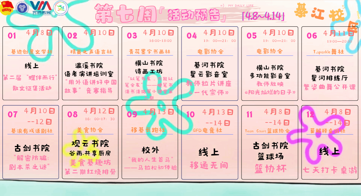 更多精彩活动等待同学们打卡,下周邀请各位王子、公主们一起体验愉快的社团时光!