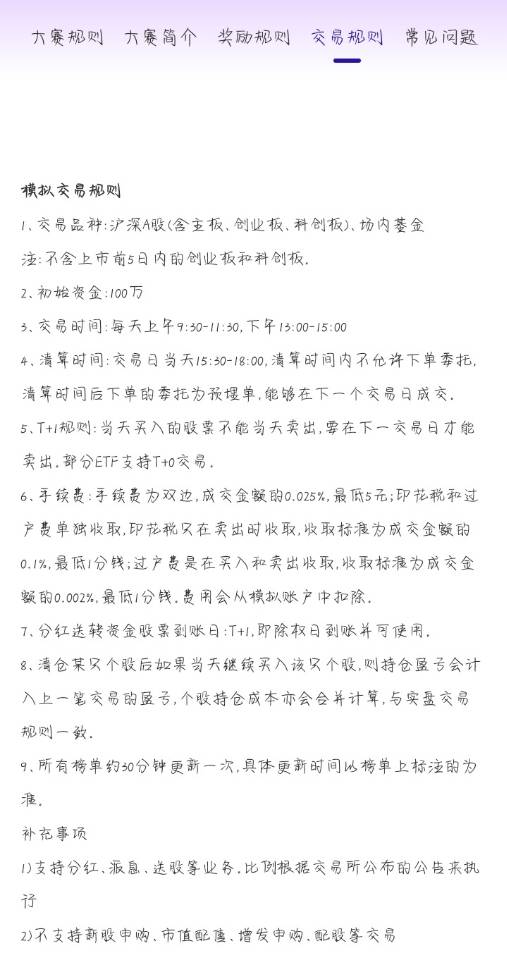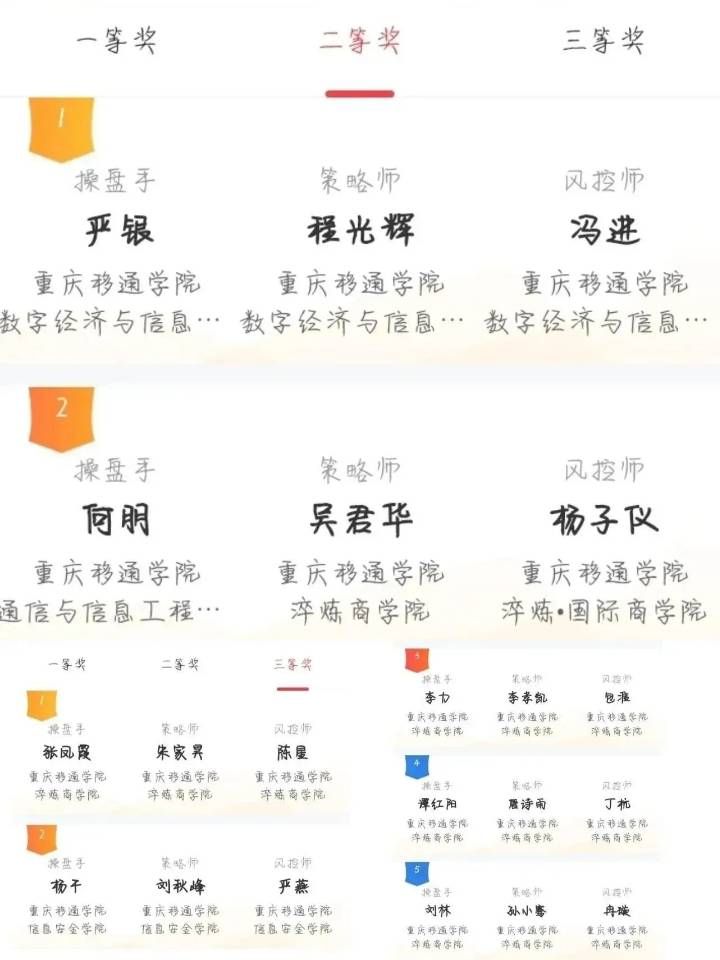 校赛:比赛形式为个人赛,进行模拟交易;各校综合收益率排名前30%的学生进入省赛。