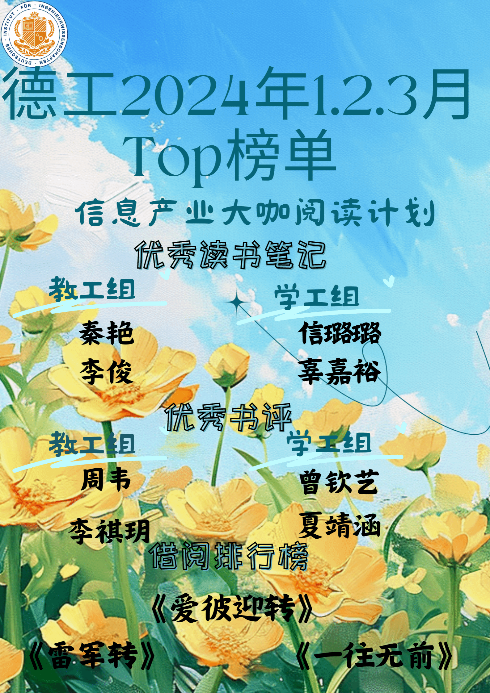 德国工程学院信息产业大咖传记阅读计划1、2、3月的大咖阅读活动不断推陈出新,为同学们带来更多有趣有益的体验,我们深感此项活动是学校特色育人新举措、品牌项目,同时在活动中相互交流、相互学习,共同进步。在阅读过程中,我们充分利用了校内丰富的阅读资源,感受知识的交叉融合,让阅读成为习惯。在我校“四位一体双院制”培养模式的启发下,通过德国工程学院一系列创新融合,我们深知大咖传记阅读不是简单的阅读,而是精彩故事,是创新思维,是一种自觉且充满乐趣的成长途径。