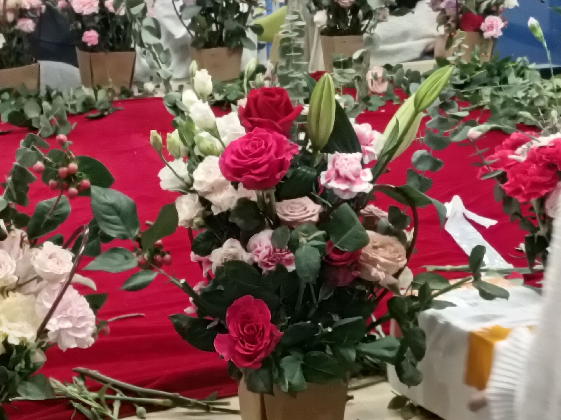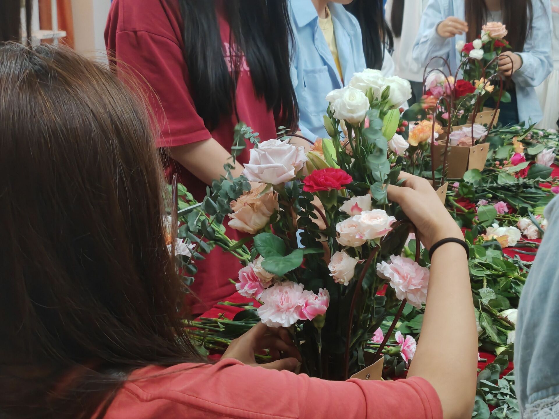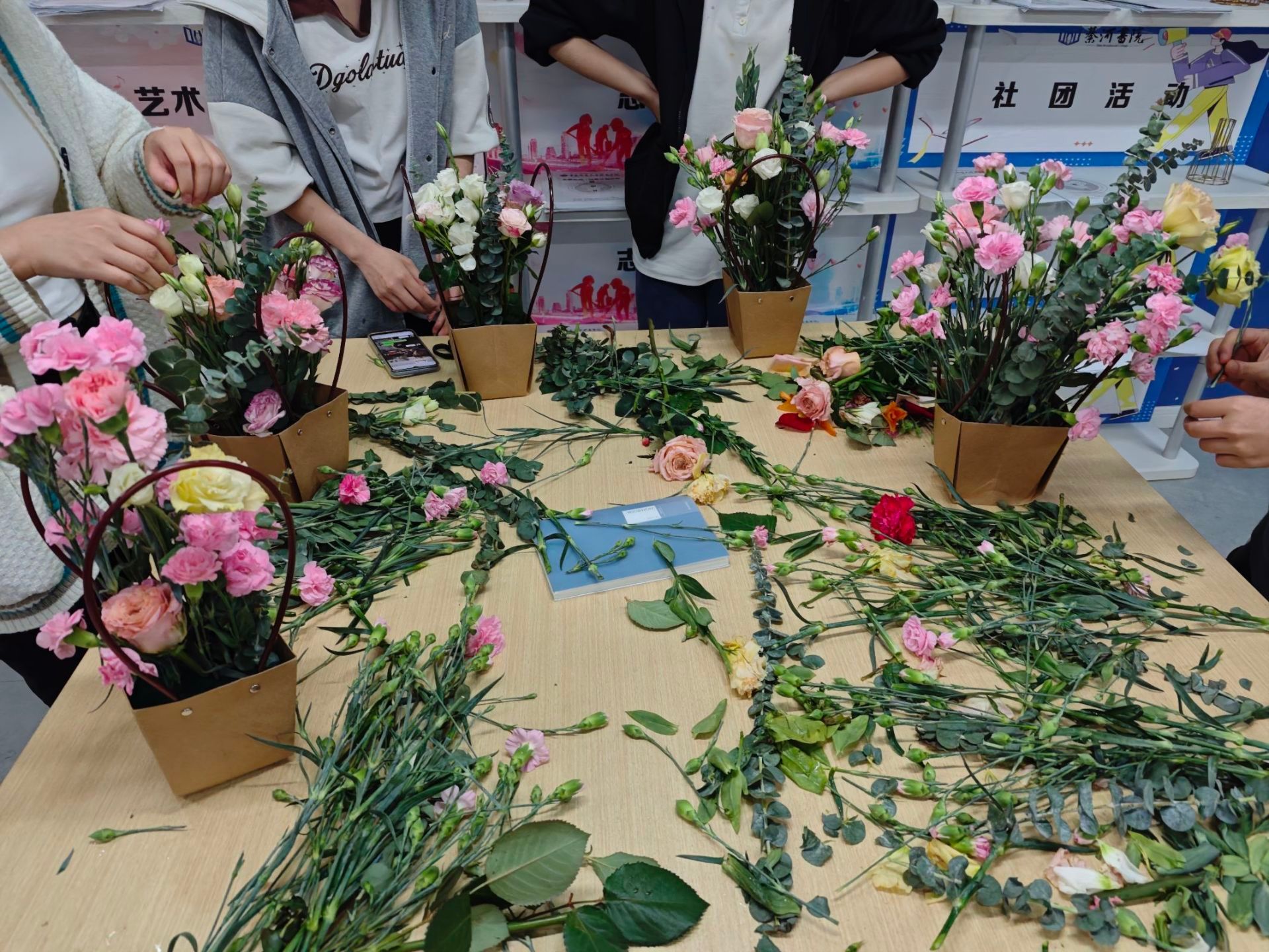 在活动开始前,工作人员对活动现场进行了精心布置,准备了丰富的花材和工具,并且将所需要的花全部修剪,醒花,绽放出了花儿们的千姿百态,随后工作人员将花泥进行修剪装进花篮,摆放在桌面上。同学们首先挑选她们心仪的花,然后充分发挥她们的创意,创作出独具特色的插花作品。