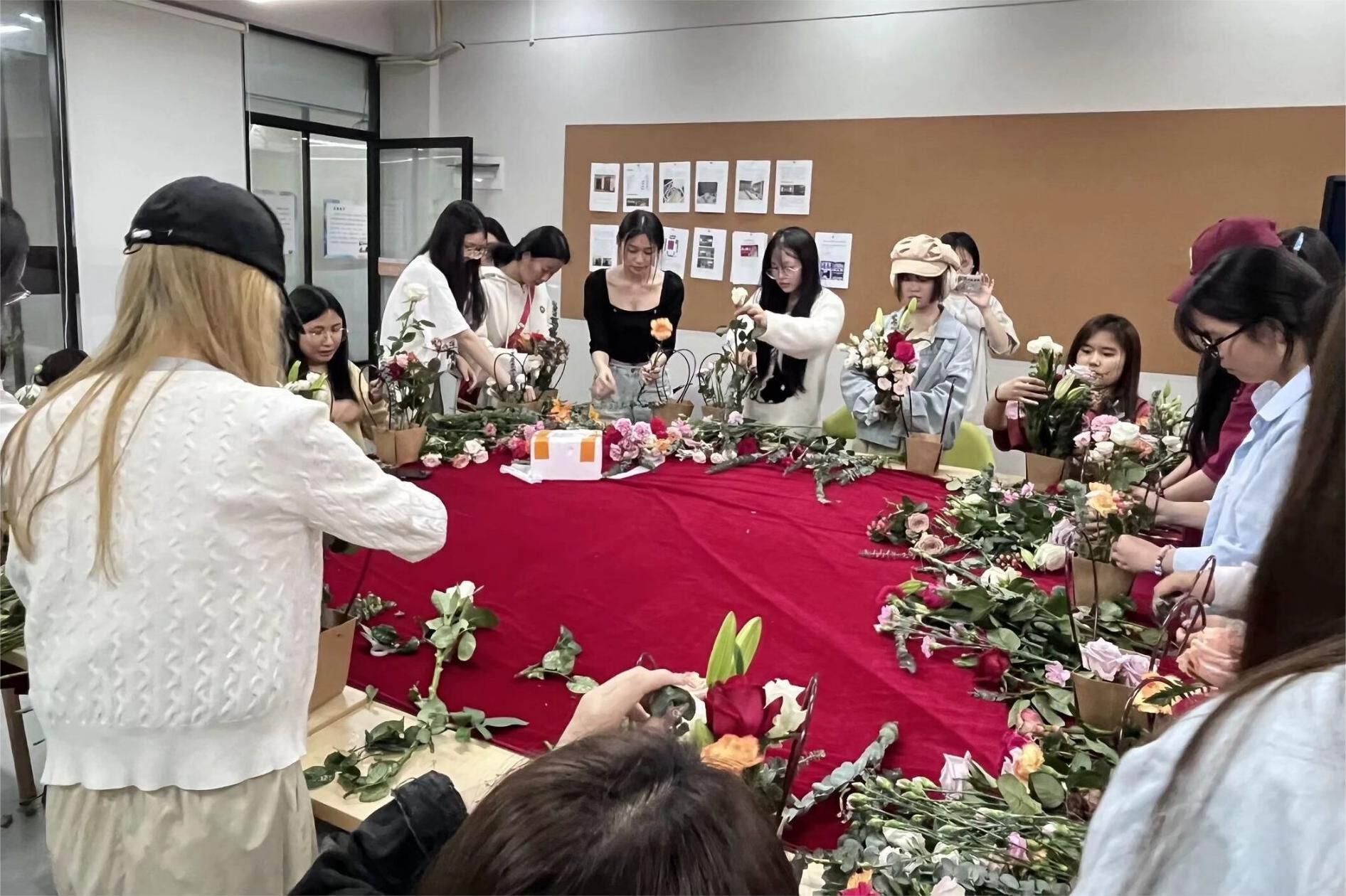 在活动中期,工作人员简单讲解了活动的规则,随后同学们自己动手实践制作花篮,一起交流讨论自己的想法,将理论运用到实际操作,充分发挥创意,结合自己的喜好搭配花卉,在欢声笑语中,一个个花篮也在慢慢制作而成。在制作花篮的过程中,工作人员随机采访了几位参与者,询问同学们对插花课程的体验如何,从中收获了什么,同学们都表达出插花课程给她们带来深切的感受,体会到了插花艺术的魅力和意境,提高了她们的动手能力,是一次非常美好的体验。