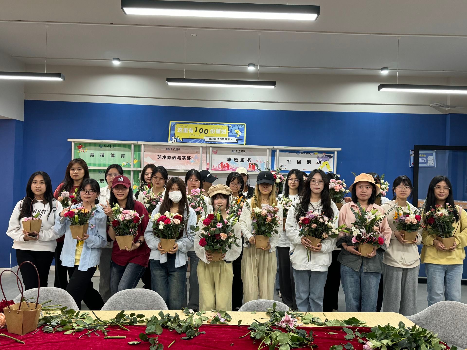 活动后期,同学们的花篮全部制作完成,进入投票环节,竞选花王,获得花王的同学将会有一个小奖品。老师和同学们在欣赏完每位同学制作的花篮后,纷纷投出了她们宝贵的一票,最终,一位同学获得了花王,随后这位同学分享了她的心得体会:“我根据自己的想法,按照花的层次和颜色,搭配起来,达到乱中有序,然后亲自动手实践,让我体会了插花的乐趣,感受到花艺创作的成就感。”最后同学们合影留恋,活动圆满结束。