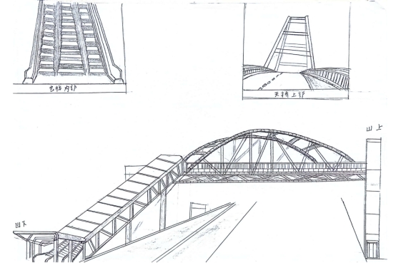 飞鹰队实地考察后,得出南北天桥目前存在:雨天道路积水过多、上下高差过等问题,对此飞鹰队结合重庆朝天门大桥、轨道交通直行电梯等实际案例进行创新设计,最终设计出集简约、先进和舒适于一体的“日月桥”。