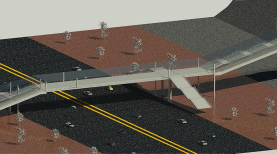 A计划队在考虑到两校区的师生授课路线和教学楼位置的前提下,将人行天桥选址在宾果城广场旁的T字道路口处,设计构思了“双流”人行天桥。此设计在为学生提供一个安全过路方式的同时还改善了部分来往车辆的交通问题,从本质上平衡人车流量、减少交通事故发生的可能,满足了桥梁所需的美观性、实用性与人文价值性。