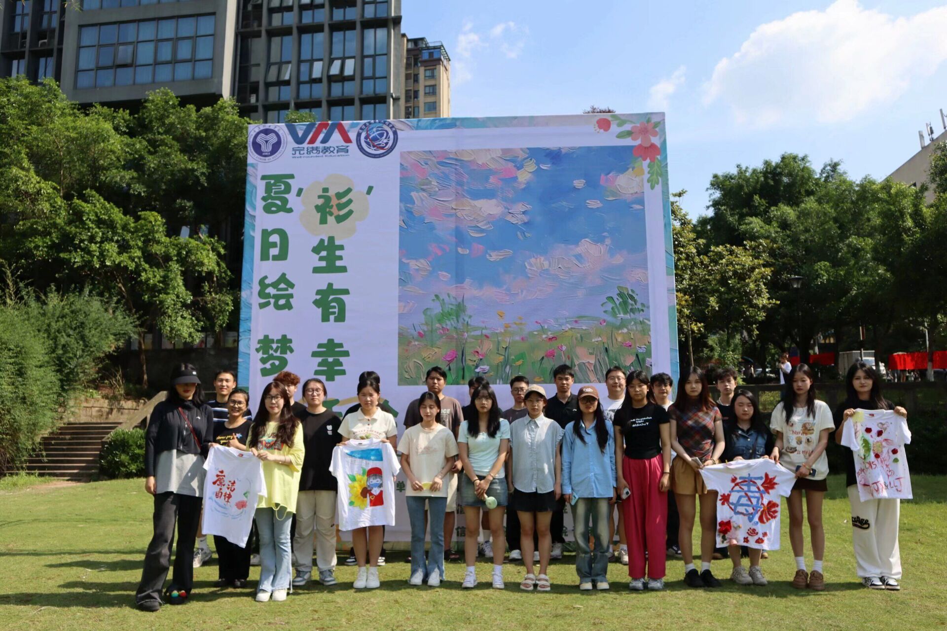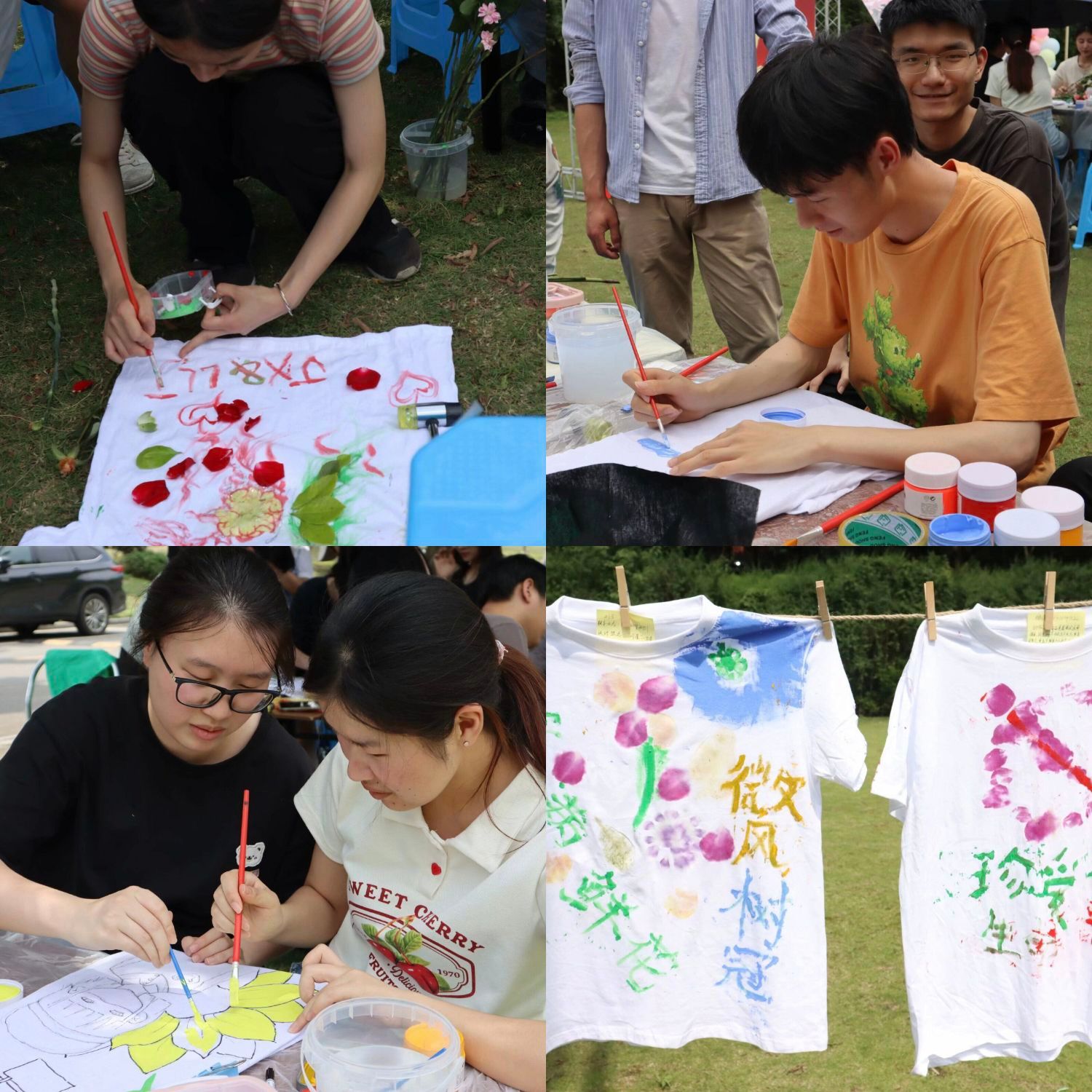 活动伊始,工作人员为各小组发放DIY文化衫原材料,白体恤、绘笔、小水桶、五颜六色的鲜花与颜料等。同学们在绘画过程中,认真构思,各展才华、相互学习、博采众长。在同学们共同探讨如何更好地活动表达主题的过程中,增强了同学们的人际交往能力,也培养他们的创意思维和审美乐趣。
