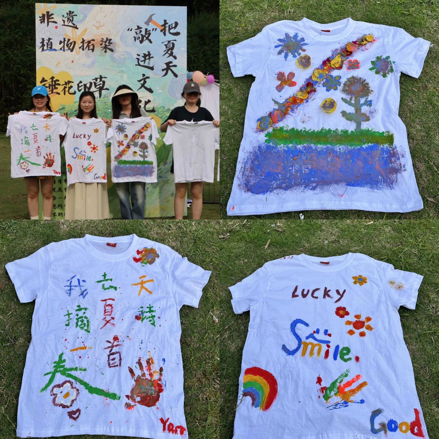 植物拓染,定格美丽:拓染技术最早起源于中国是一种古老的花纹制作技术。易逝的自然之美,通过拓染技术,化瞬间为永恒。参与学生将花朵、树枝等植物作为设计灵感,用拓染技术在文化衫上呈现出它们的美丽图案。在同学们的精心制作下,美丽被定格,这是宝贵的艺术财富,是同学们对童趣的追求,对青春的向往。一层层艳丽色彩的不断呈现,都是同学们脑海中独一无二的梦。