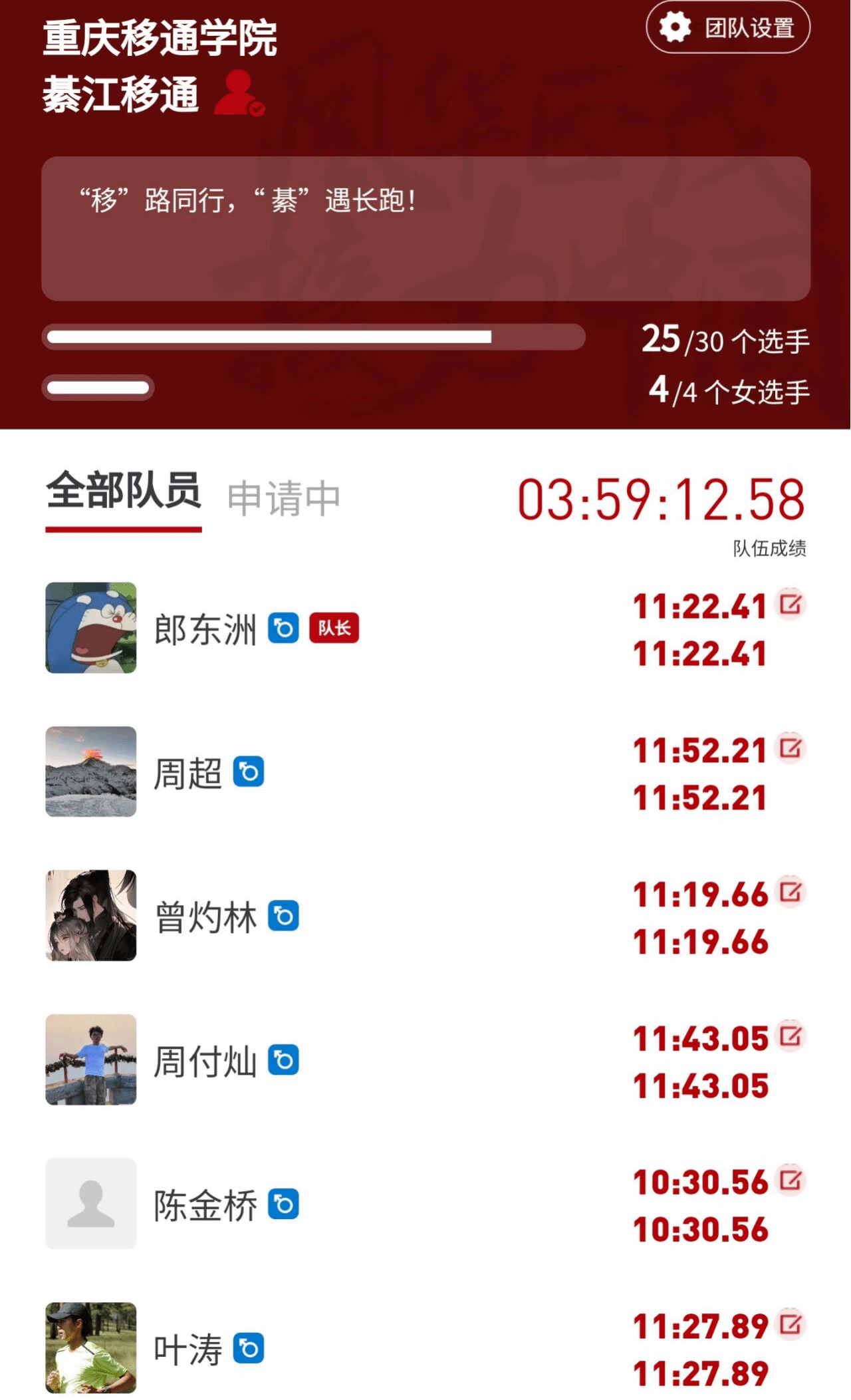 在这场比赛中,作为领跑者的陈金桥同学,凭借出色的实力和毅力,以10分30秒的优异成绩率先冲过终点,荣获冠军。女队成员周倩倩同学同样表现出色,她以12分22秒的成绩刷新了自己在3000米项目上的记录。其他19名队员也均在规定时间内成功完成了比赛,全队总成绩达到了3小时59分12秒。