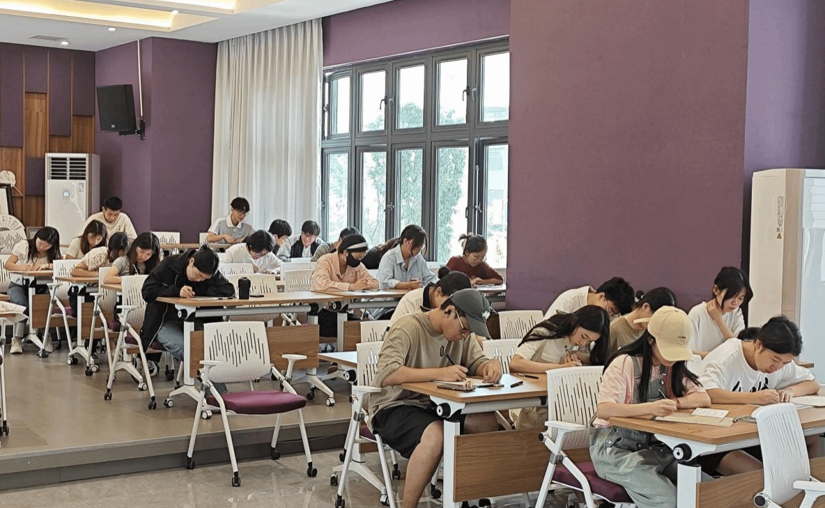 大赛开始,在两位社长的主持下,现场的参与者们已逐渐进入状态。平铺纸张,右手执笔,全神贯注已成为参赛选手的一致状态,手中笔墨缓缓移动,书写速度虽慢,但成果却极为出色。一些同学从反复在草稿纸上练习,到谨慎下笔,而后步步坚定,字字生花。他们微微低头,心神已然完全融入眼前的字墨世界之中。在这般氛围里,都能够深切地体会到同学们对书法艺术的尊崇与热爱,以及他们努力追求极致、展现自我的执着信念。