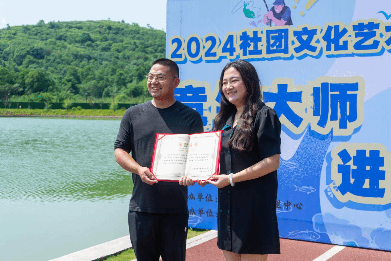 活动伊始,主持人隆重介绍了刘涛大师的个人事迹并代表我校学子对刘涛先生的到来表示热烈的欢迎。随后,由校团委社团发展中心主任杨佳燕老师为刘涛先生颁发了重庆移通学院2024社团文化艺术节专场之“竞钓大师进校园”活动的特邀证书,以表达对刘涛先生能参与本校活动的感谢和欢迎。此次活动刘涛大师以“钓鱼摆台、定点打窝、饵料选择”三个方面用亲身实践向同学们展开了一次户外竞钓实操课堂。