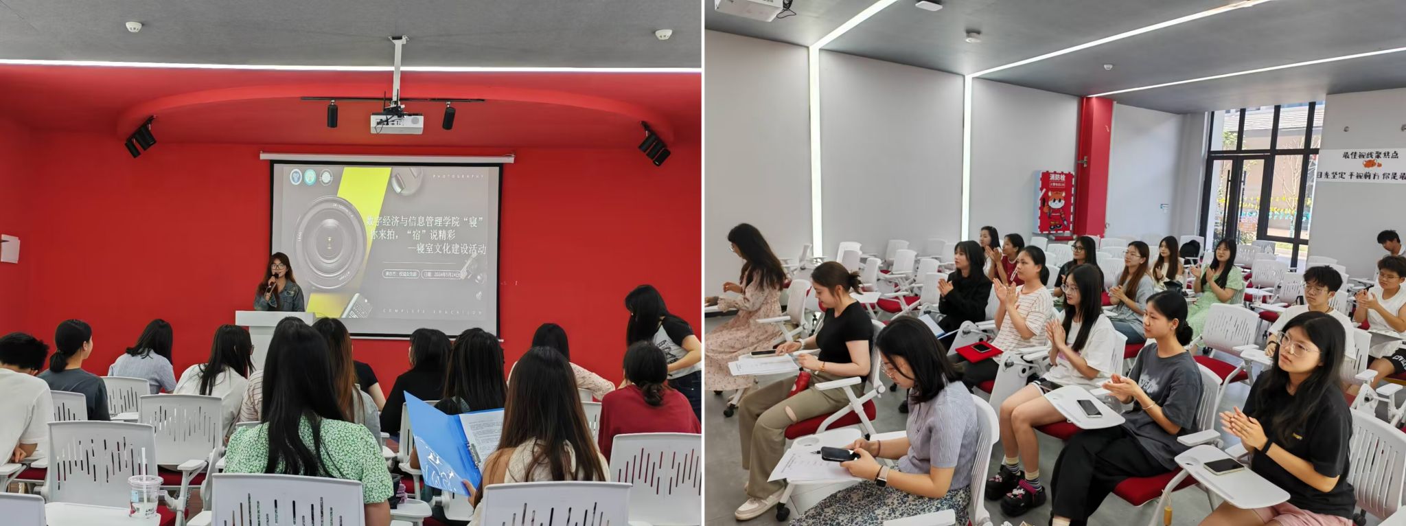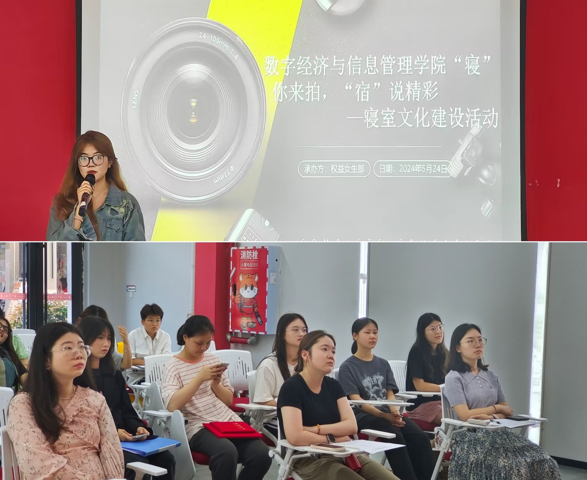春风拂面的五月,褪去了春天的温柔,迎来了一丝夏天的炙热。为增强学生对寝室的归属感,丰富寝室的文化内涵。数字经济与信息管理学院权益女生部于2024年5月24日在玉堂书院Talking演讲中心成功举办“寝”你来拍,“宿”说精彩—寝室文化建设活动。活动有幸邀请到数字经济与信息管理学院学生办公室主任任超群老师,宣传版块指导老师田园园老师、艺术修养与实践版块指导老师吴倩蓉老师,作为评委嘉宾出席。