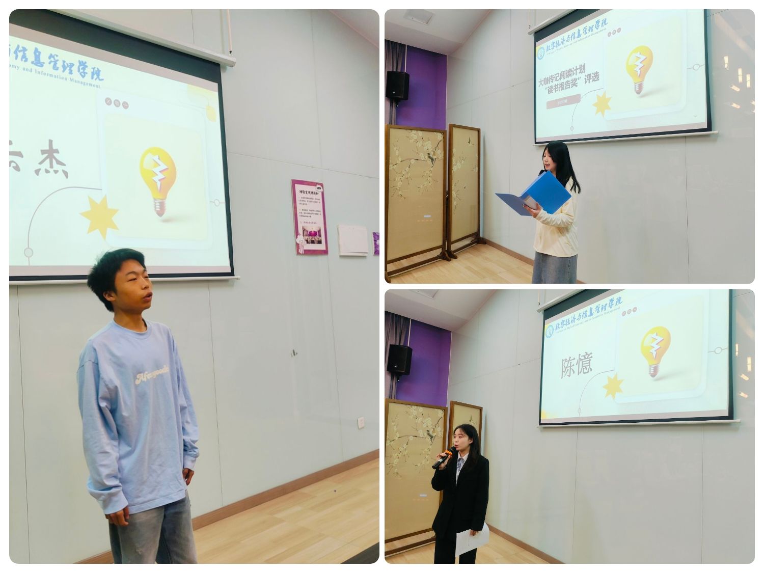 诵读经典,我们寻找万里山河的广阔;对话圣贤,我们领略大咖文化的魅力。大咖一直是大学生努力的标杆,是影响大学生未来的重要角色。为落实信息产业大咖阅读计划,培养同学们的大咖阅读兴趣并增强同学们的大咖阅读能力,数字经济与信息管理学院于2024年5月30日13点在观云书院的小雪会议室成功举办了重庆移通学院“信息产业大咖传记阅读计划‘读书报告奖’数字经济与信息管理学院初选活动。本次活动有幸邀请到数字经济与信息管理学院团总支书记潘锐老师,学工办主任任超群老师,就创板块指导老师陈燕华老师三位老师作为评委嘉宾出席,一起领略同学们带来的精彩读书感悟。
