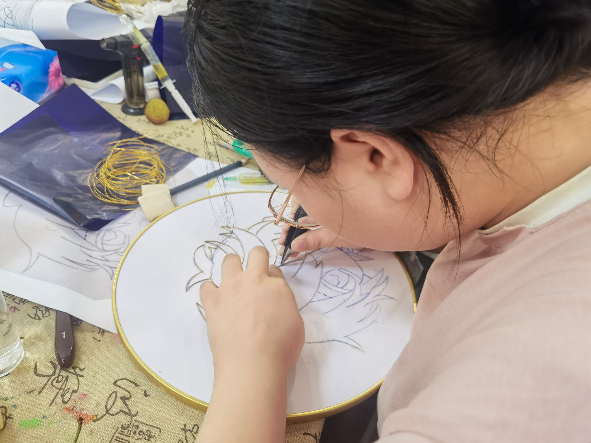 活动伊始,非遗传承人龚开寅老师给大家详细介绍了掐丝珐琅工艺的历史渊源、艺术价值等,并示范了掐丝珐琅画的制作步骤和手法技巧。讲解完后,学生结合前期课堂设计的作品手稿进行了现场制作。