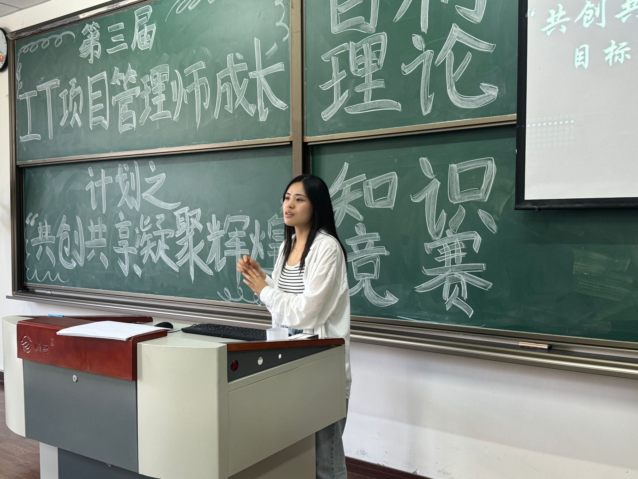 为激发我校学子对IT项目管理领域的浓厚兴趣,提升同学们的专业素养和判断能力,为未来的职业发展奠定坚实基础。数字经济与信息管理学院于2024年6月5日下午14:30在双栀教学楼109成功举办了第三届IT项目管理师成长计划之“共创共享、凝聚辉煌”目标知识竞赛。本次活动有幸邀请到数字经济与信息管理学院社团活动板块指导老师吴丽玉老师,作为嘉宾出席,为同学们的比赛过程提供专业指导和监督。