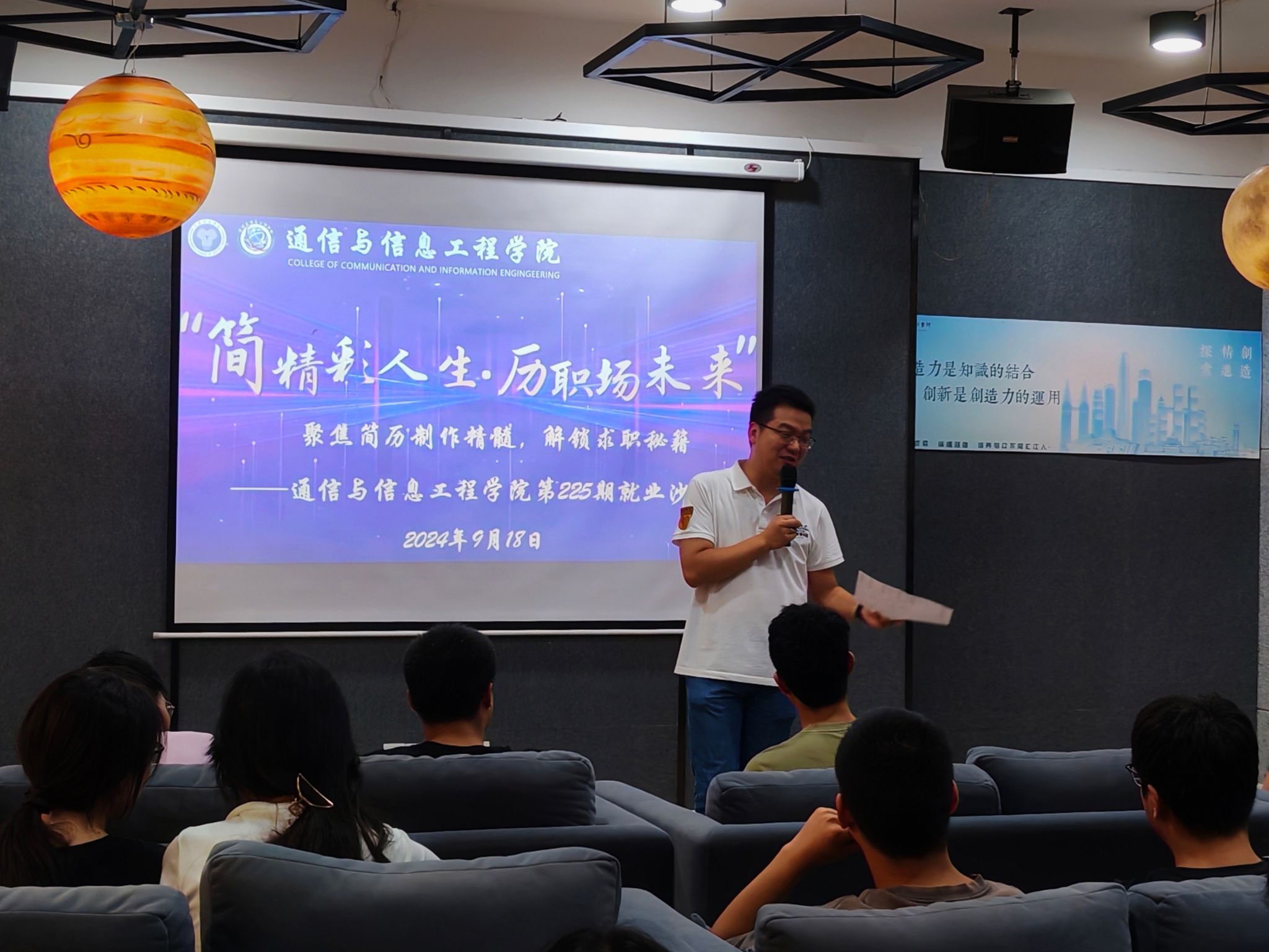 为帮助大四同学掌握简历制作的技巧与方法,做好求职准备,由就业创业指导与服务中心主办,通信与信息工程学院承办的“简精彩人生·历职场未来”——通信与信息工程学院第225期就业沙龙活动于2024年9月18日在汇江书院影音活动室顺利举办。此次活动有幸邀请到国际教育学院综合办公室主管杨德龙老师担任主讲人,为同学们分享简历制作技巧,并现场展开简历指导。