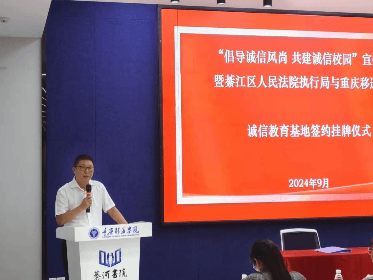 为了进一步深化诚信教育,加强法治与诚信的深度融合,綦江区人民法院执行局与重庆移通学院携手合作,共同在9月27日綦河书院举办“倡导诚信风尚,共建诚信校园”诚信宣传活动,并设立法治教育基地与诚信建设基地。让学生近距离感受法律的威严与诚信的力量,激发他们自觉践行诚信规范的内在动力,本次活动还特别邀请了綦江区人民法院执行局刘扬局长莅临现场。