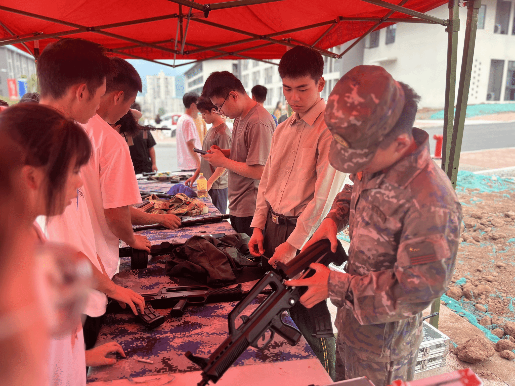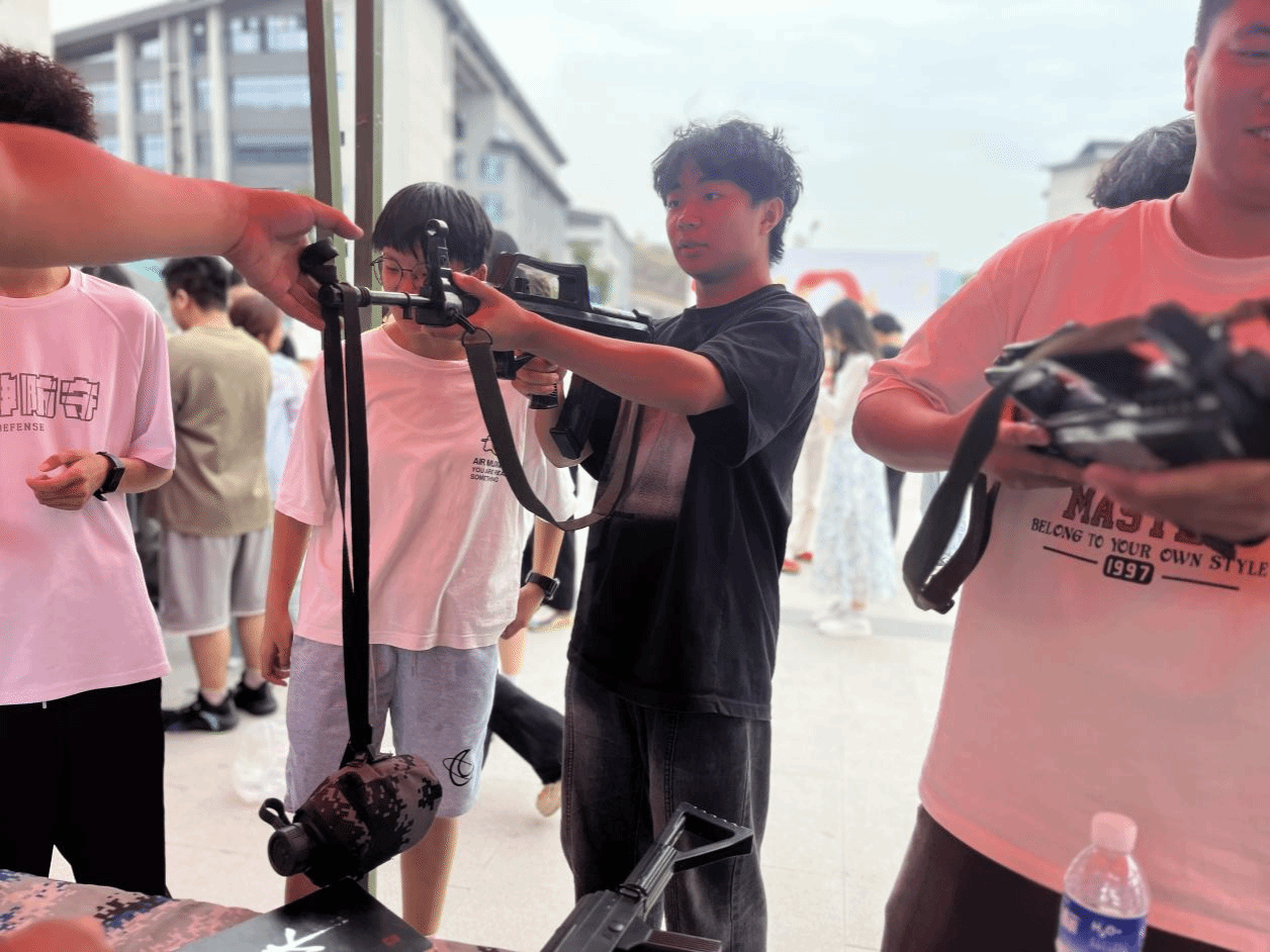 在装备体验区,迷彩俱乐部的队员们身穿标准的体能服,精神抖擞地向参观的移通学子展示一系列精致的装备模型,其中包括经典的95式突击步枪、79式冲锋枪以及精准无匹的88式狙击步枪。每一个模型都经过精心制作,忠实还原了真枪的细节,仿佛将人们带入了实战的紧张氛围之中。