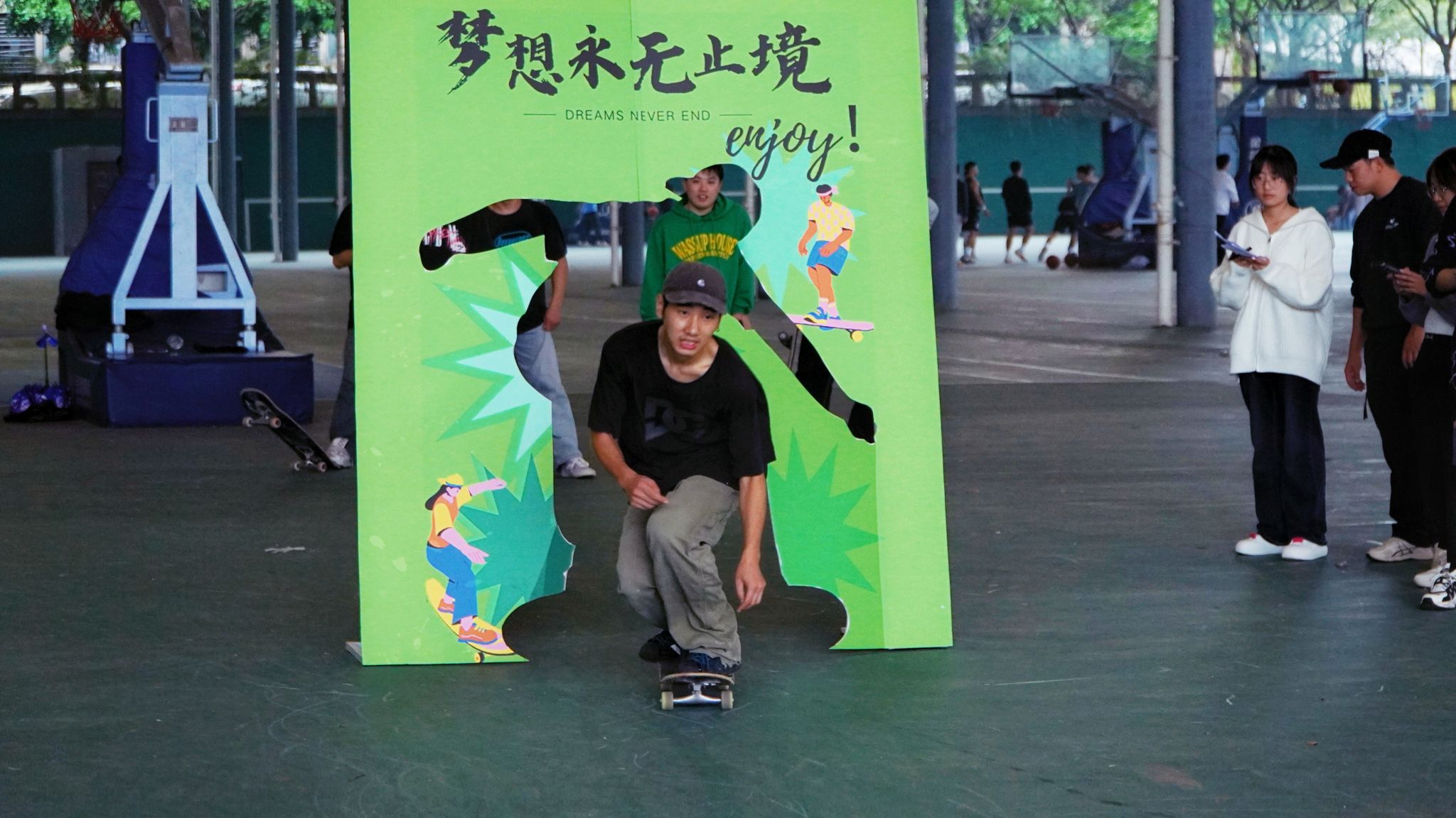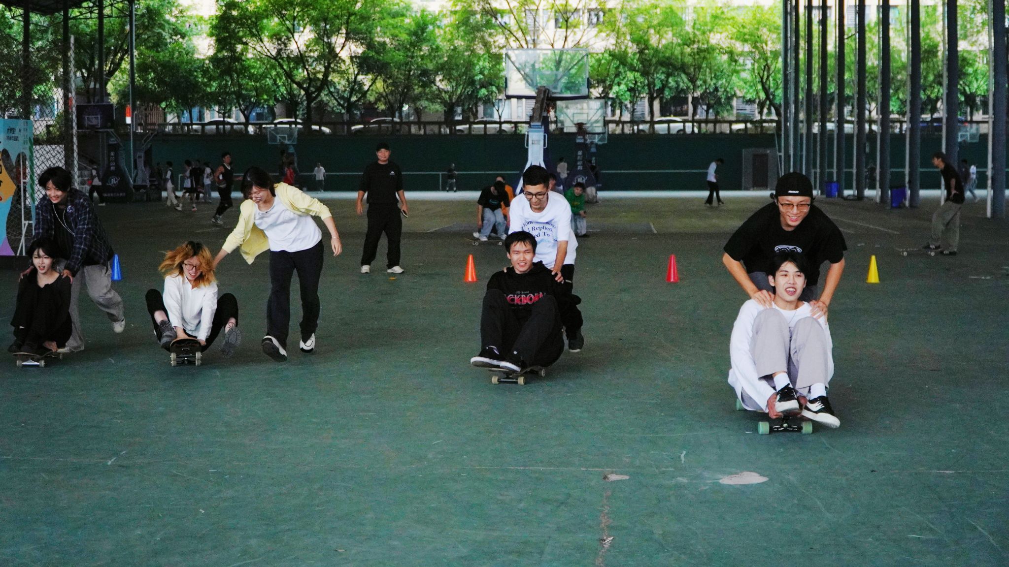在活动开始前,为大家准备了轻松欢快的音乐调动情绪,让参与者们可以伴随着音乐进行比赛环节前的拉伸。滑板高手们在音乐下跳跃,舞出一场震撼人心的表演,将现场气氛推向了高潮。他们矫健的身姿、流畅的动作,仿佛在诉说着滑板运动的无限魅力,点燃了每一位在场学生的滑板梦想。当音乐停止,目光聚集,我们的活动正式开始。用生动的语言和有趣的肢体动作来进行讲解,将此次滑板活动的内容和规则娓娓道来,让在场的每一个人都对些环节有了初步的认识。