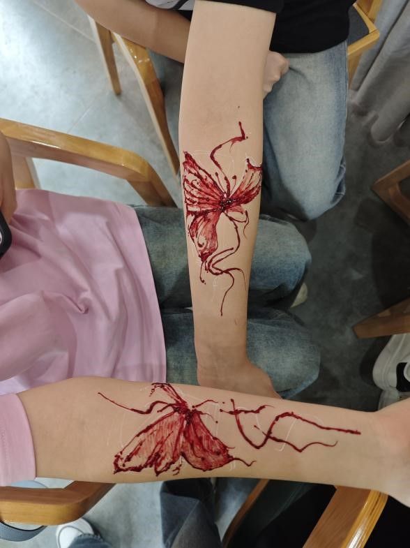 在美妆协会负责人的帮助下,参与者们开始在海娜手绘师的指导下,尝试绘制自己的图案。有的选择了简约的线条图案,有的则选择了复杂的图腾设计。每个人都沉浸在创作的乐趣中,现场气氛热烈而愉快。