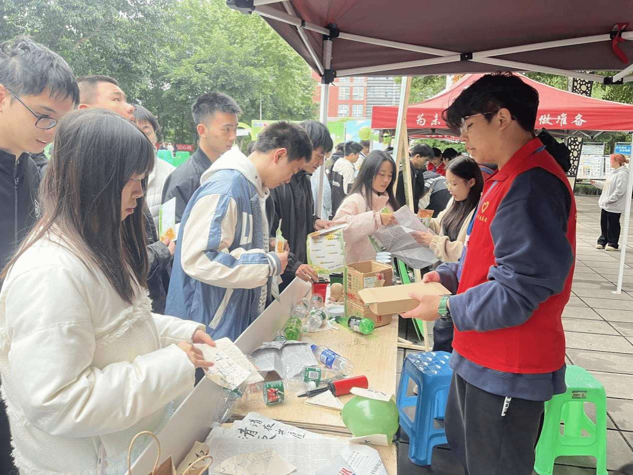 该环保集市共有“旧物换新区、创意改造区、自然手工区...”等5个区域。活动伊始同学们根据志愿者引导纷纷在环保寄语墙上写下“绿色无废”相关寄语,并前往相关区域参与“无废”活动。