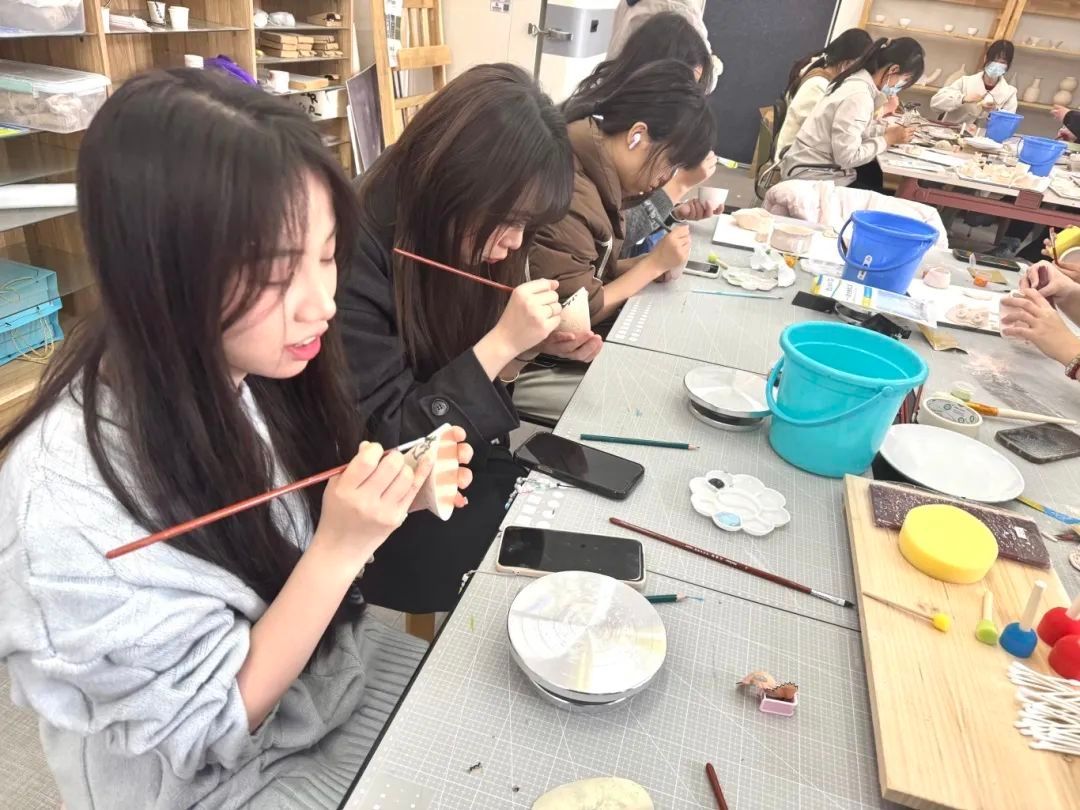 活动伊始,汪老师为大家展示了陶艺创作的全过程,详细阐释了釉下彩与釉上彩的差异,还针对器物的结构特点,讲解了如何合理布局彩绘位置以突出主体纹样,营造丰富的视觉层次。现场还示范了打磨与抛光技巧,每位同学也在亲自动手中切身体验了坯体从粗糙到光滑的质感变化。