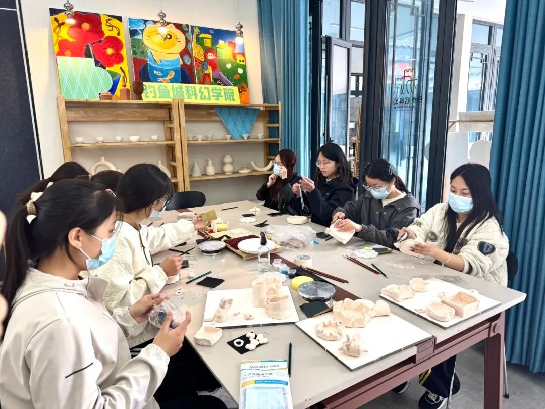 在活动的最后,汪老师带领大家欣赏了世界知名陶艺艺术家的代表作品,使在场的每一位同学都体验到不同文化语境下的陶艺美学,并激发出更多创作灵感。此次“春日上釉,邂逅色彩魔法”陶艺体验活动,既是一场技艺的深度学习之旅,也是一次心灵的愉悦放松;在泥土流动、色彩飞扬的瞬间,每一道纹路、每一抹色彩均成为同学们内心真实情感的艺术表达。活动结束后,大家纷纷表示希望能进一步深入陶艺学习,而钓鱼城科幻学院CMF陶艺工坊也将继续策划更多跨学科、跨媒介的艺术体验活动,为同学们搭建更为广阔的实践平台。