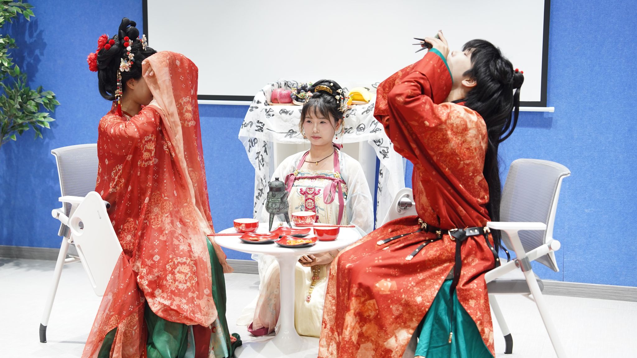 本次活动复刻唐代婚俗礼仪的传统文化体验活动,以周礼“六礼”为核心框架,融合唐代开放多元的社会风貌,通过沉浸式仪式展现古典婚仪的庄重与浪漫。活动通常包含“纳采”“亲迎”“却扇”“同牢合卺”等经典环节:新人身着唐代青绿钗钿礼衣(男服绯红,女服青质花钗),以“障扇蔽面”演绎古意。现场辅以古乐演奏、礼仪讲解,生动还原“礼仪三百,威仪三千”的唐代婚俗场景。