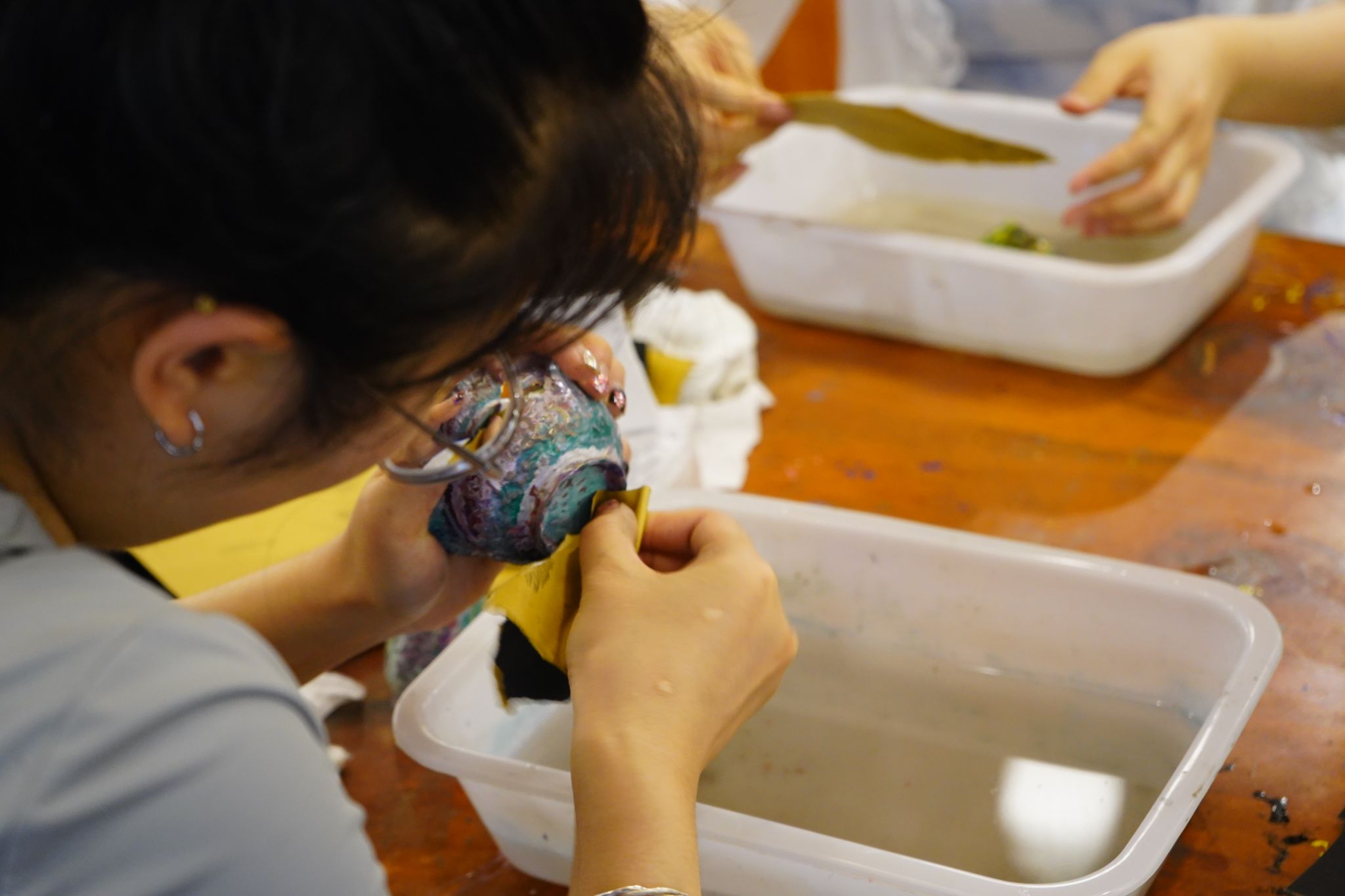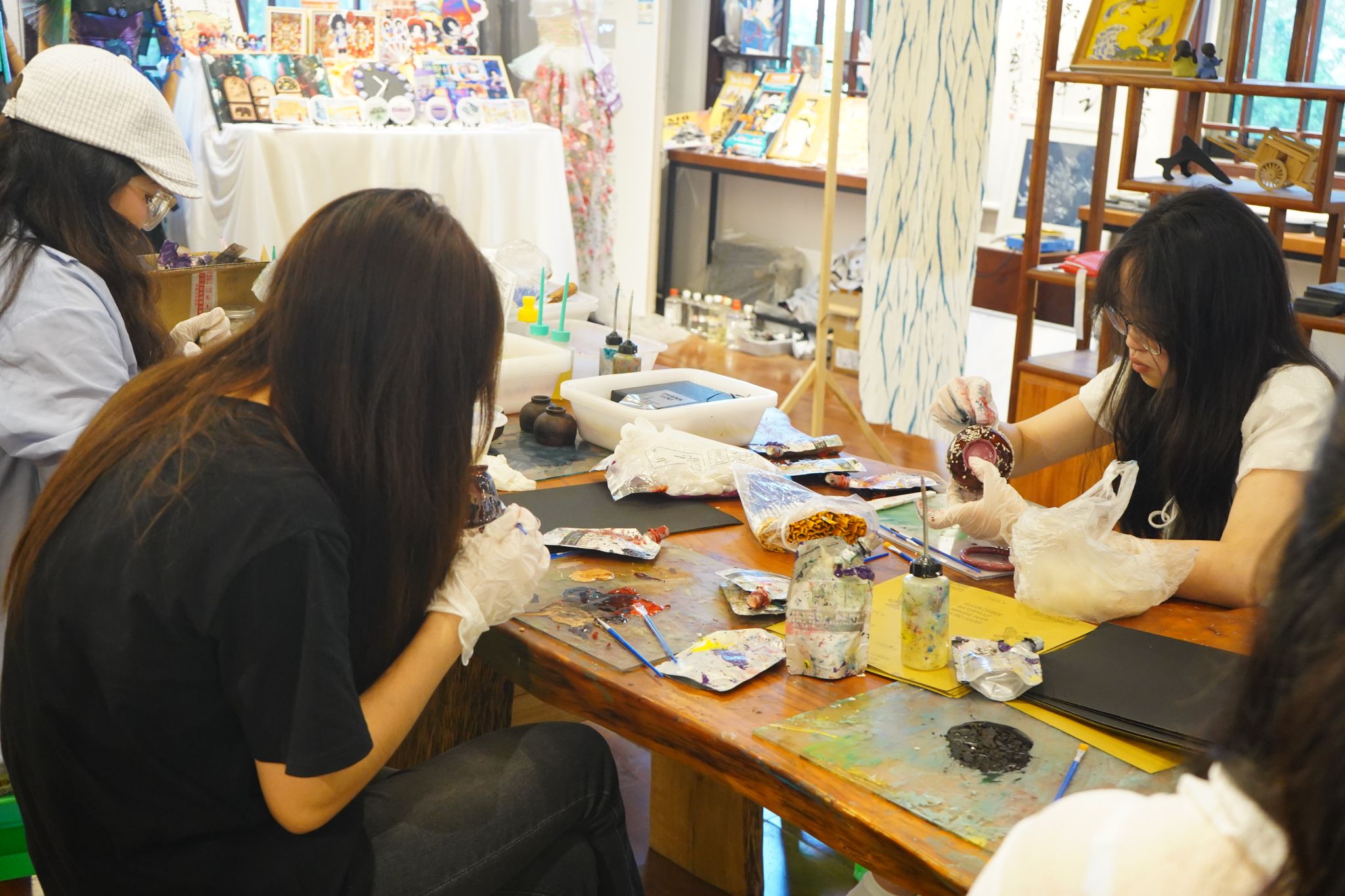 创作现场,有人专注于打磨蛋壳镶嵌的边缘,使其与漆面浑然一体;有人反复推拭着金粉勾画的线条,让那流动的金色在深邃漆底中若隐若现,更添神秘;还有人尝试多层薄髹叠加,探索漆色在精磨细推后呈现的微妙渐变与深度。老师们穿行其间,不时拿起半成品对着光线细察,指点着漆膜是否足够饱满均匀,光泽是否温润内蕴,提醒着“推光之道,贵在恒心与手感,心静则漆明”。而若漆器打磨的结果不尽如人意,也无需气馁。因为每一次创作都是全新的起点,不到最后一刻,永远不知作品会绽放怎样的光彩。