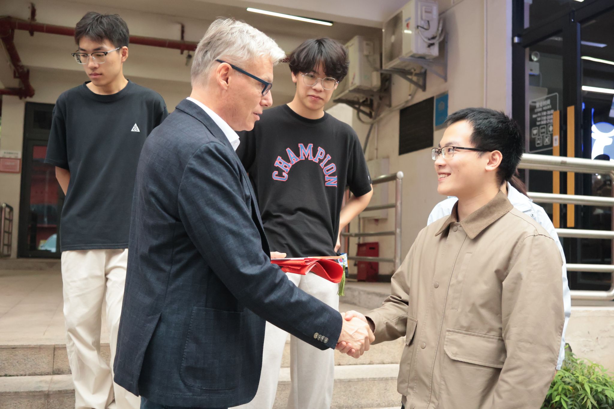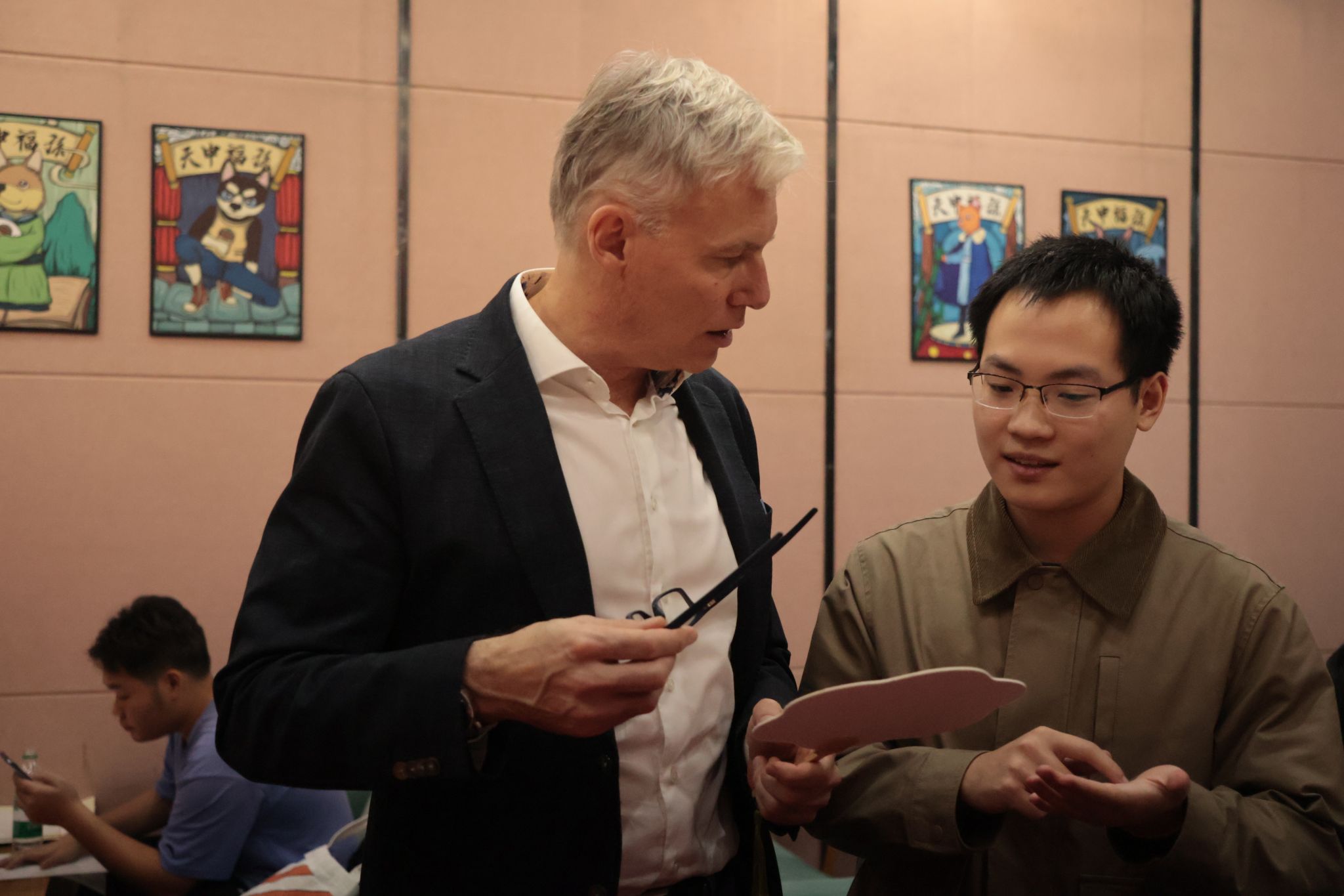 活动临近尾声,薛龙泽同学拿出一个精致的圆扇,扇面上正是用清秀字体书写的“业精于勤”四字。“这是我们特意为您准备的礼物,希望这把扇子能带着书法的温度,陪伴您追逐梦想。”Nils教授惊喜地接过扇子说:“太珍贵了!今天不仅学会了写汉字,还感受到了中国文化的温暖,这把扇子我会永远珍藏。”