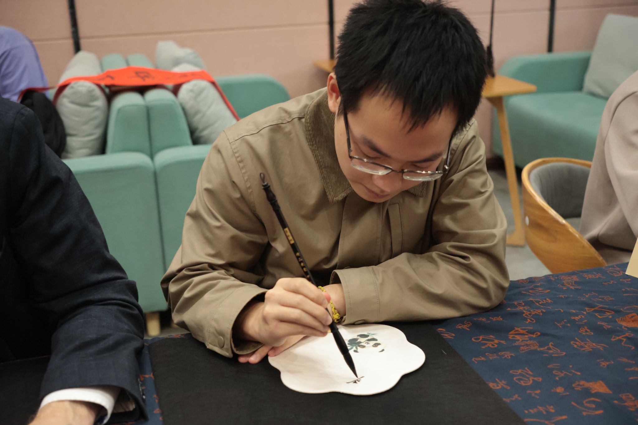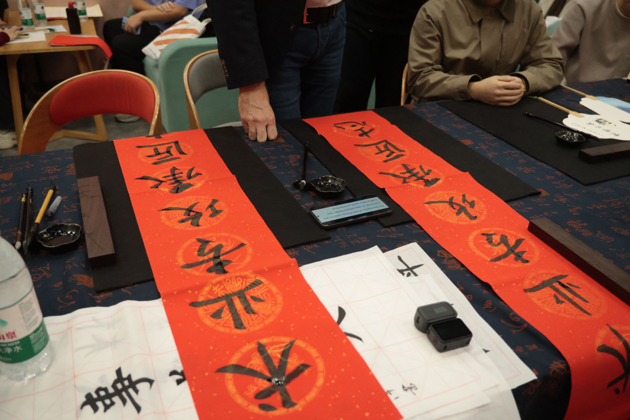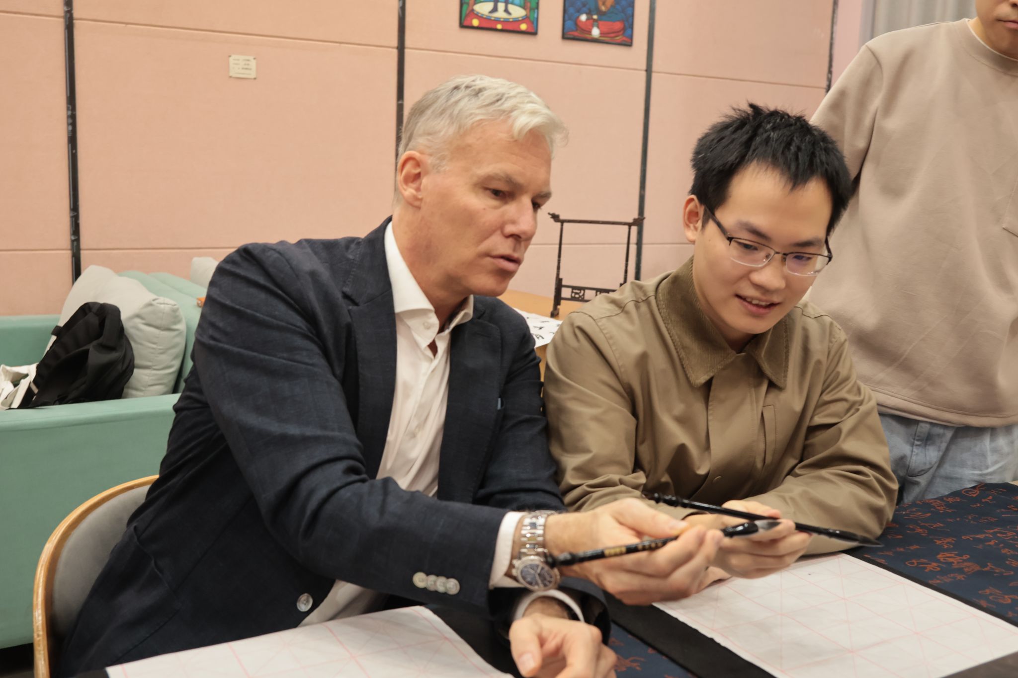 活动伊始,书法与美术协会的成员们早已将创作区布置妥当。见Nils教授走进现场,同学们热情上前迎接,引着他在案前落座。“这是宣纸,吸墨性好,写出来的字会有自然的晕染感;这是狼毫笔,笔锋挺健,适合表现笔画的力度。”何明浩同学手持笔墨纸砚,逐一介绍着书法工具的特点,Nils教授听得十分专注,不时伸手轻轻触摸宣纸的纹理,感受毛笔的柔软笔锋。