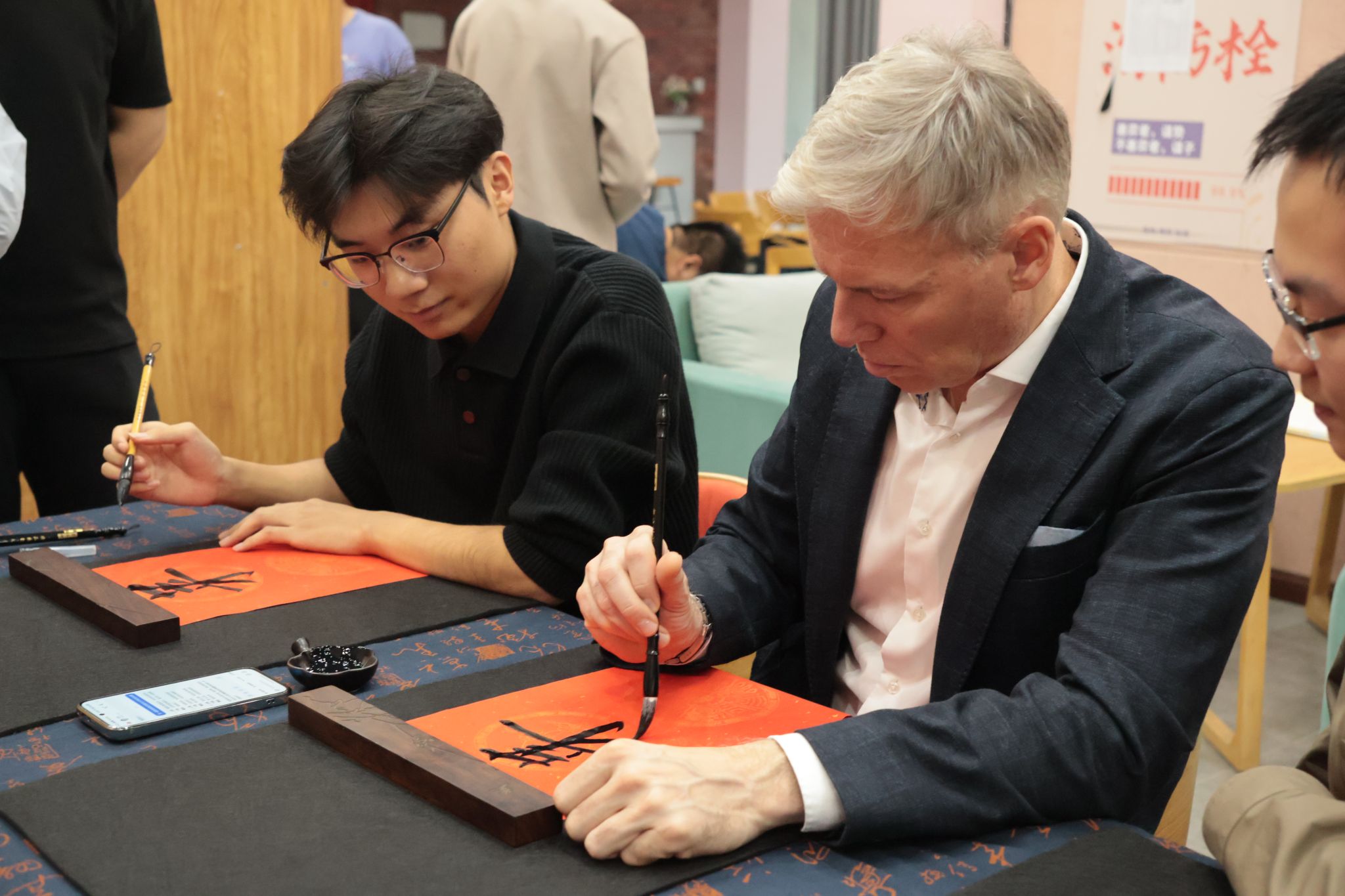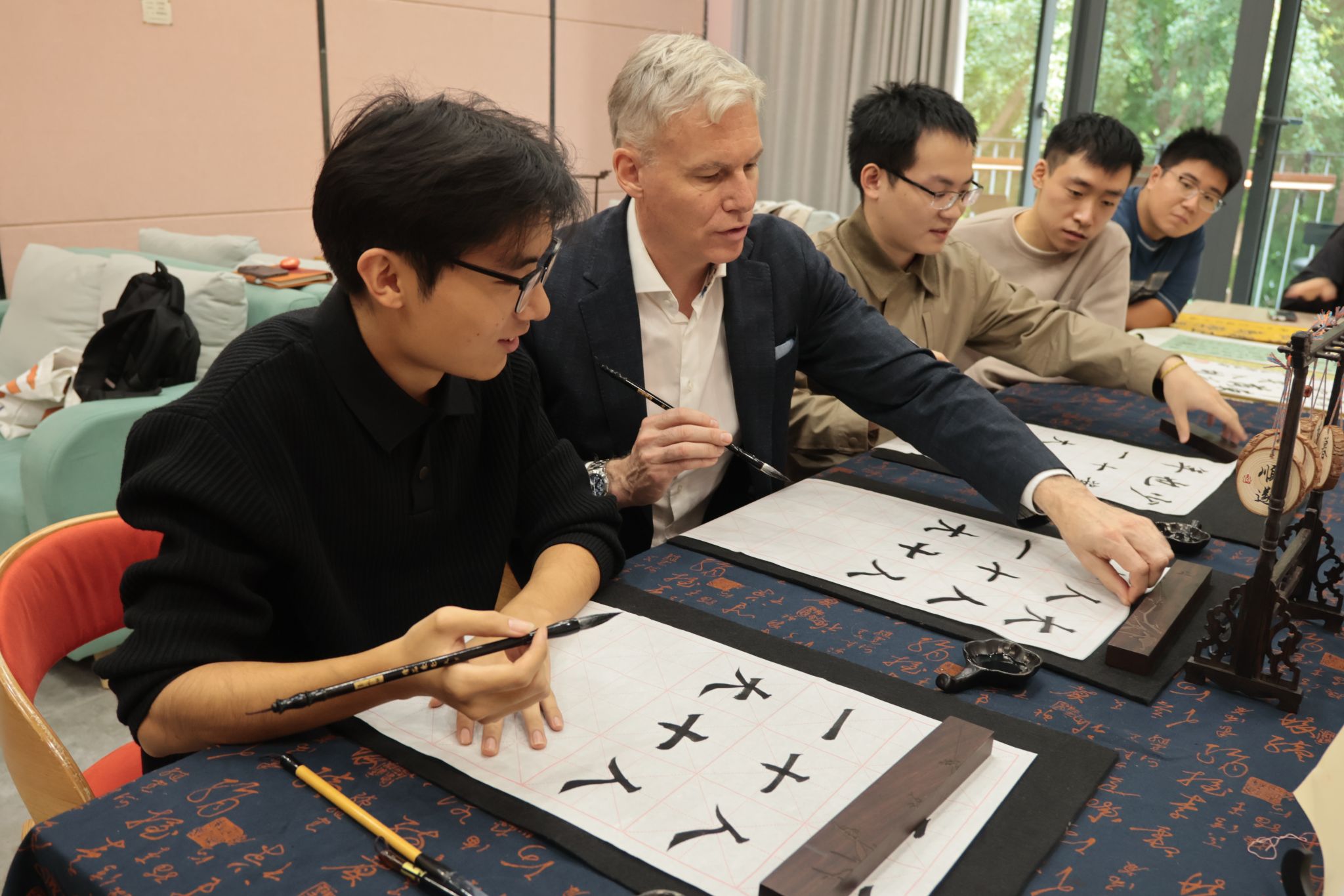 近日,翰墨飘香,暖意融融。一方方铺展的宣纸、一锭锭研磨的墨块、一支支悬挂的毛笔,为这场以“一笔一世界:外教零距离感受中国书法魅力”为主题的中外文化交流书法精品课堂活动,勾勒出浓郁的东方文化氛围。德国工程学院携手别都书院特别邀请 SRH 中国项目负责人 Prof. Dr.-Ing. Nils Roman Albrecht,以笔为媒、以墨为缘,与师生共同沉浸在中华书法艺术的独特魅力中,开启一场跨越国界的文化对话。本次活动由冲 “雅” 协会、书法与美术协会、“书香浓情,你我同行”志愿服务专项支队联合举办。