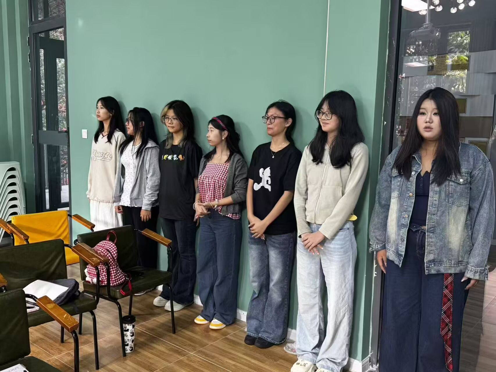 培训伊始,站长强调了专业形体姿态对于科学发声的奠基性作用。“形正则气顺,气顺则声稳”,挺拔的身姿是发出洪亮、持久声音的物理基础,培训的第一项内容便是矫正体态,全体成员在站长的示范下于场地一侧有序进行靠墙站立练习,由三位站长轮流纠正站姿问题。女生双脚并拢,身体后枕骨、肩胛骨、骶骨与脚跟均与墙面接触,感受脊柱的延伸与挺拔;男生则需达到“声形兼备”的沉稳状态,站直站稳,确保身体中正,为发声建立稳定的支撑。