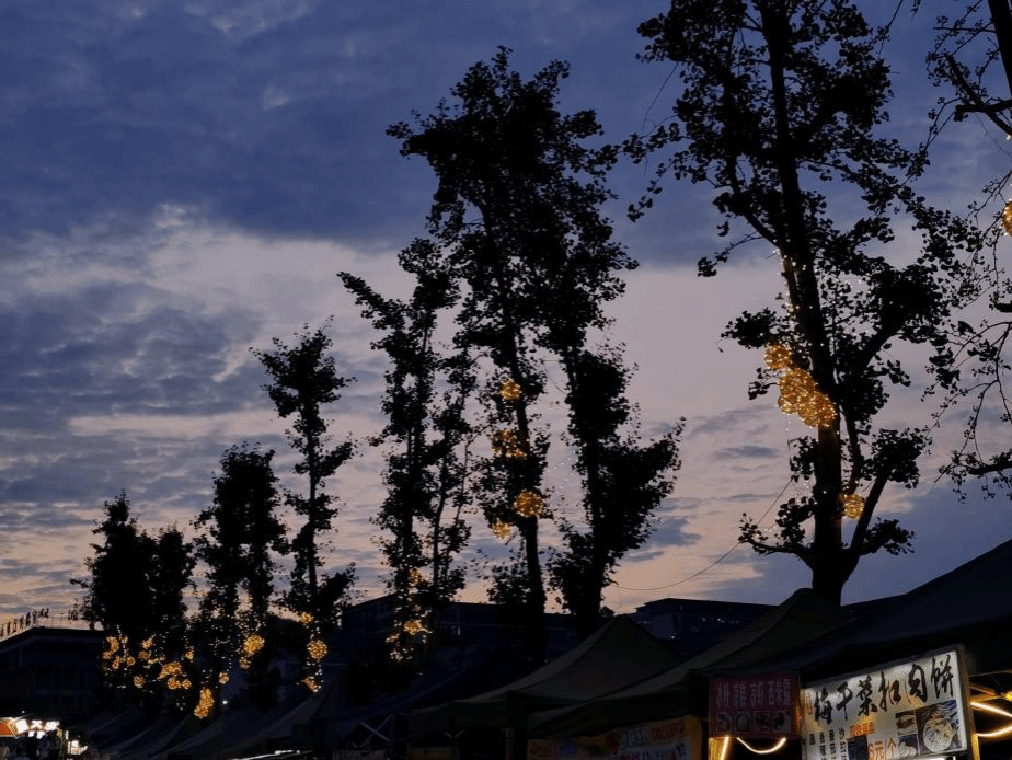 美食一条街,是移通校园的特色。当月光初现,夕阳褪去,最后的辉光打在阴沉的云上,驱散了黑暗。芸芸众树上挂着的是各自晶莹的金片,在苍穹间熠熠生辉。是美也,一种夏日风轻云淡的适然美,星光熠熠的优美。