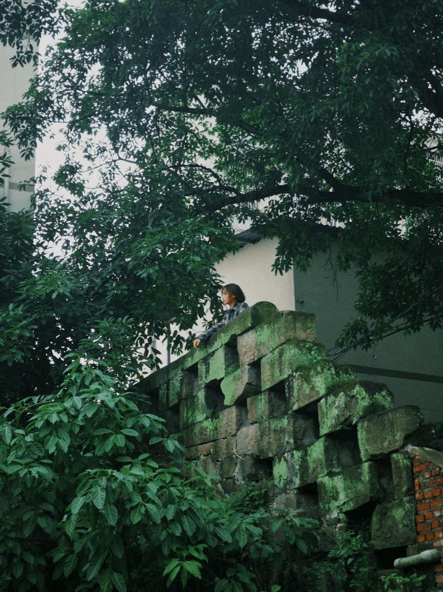 画中女孩远眺天空,四喜四忧。其蔚蓝广阔的天空,在茂叶夏更加突出美丽。独步青苔张曼的石阶,其中粽叶丛生、绿意盎然。褪去视野边上的红砖,是参天古树沉淀历史下的对远方的眺望。