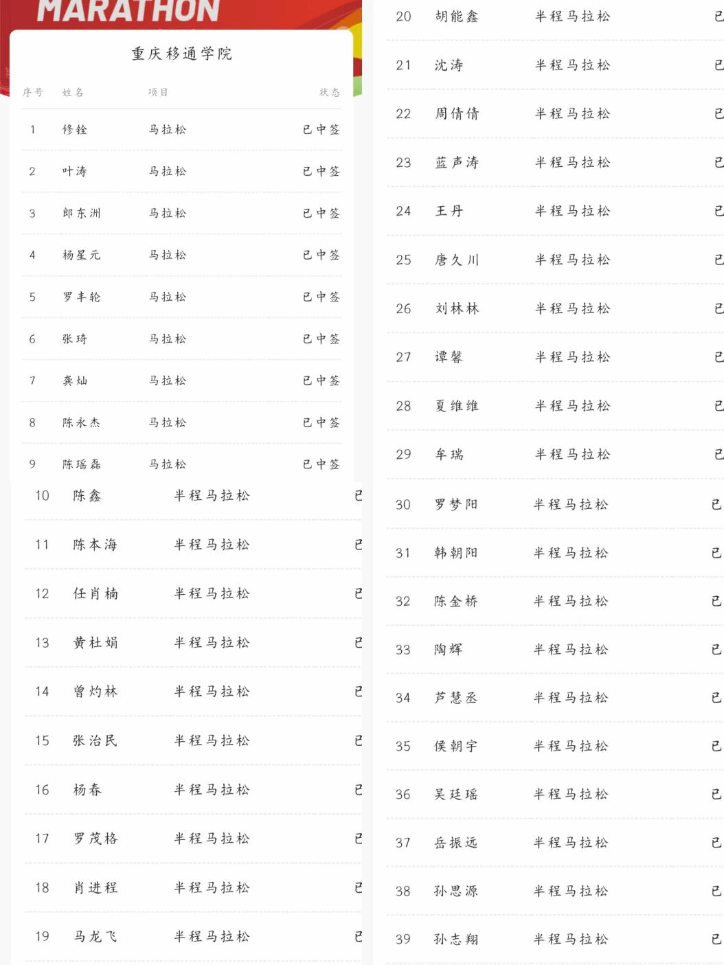 经过早晨的激烈比拼,我校39名师生全部顺利完赛。重庆移通学院与贵马高校联赛的队员们同台竞技,共同作战,用一道道奋力奔跑的身影解读热血奔腾的青春密码,他们为梦想、为热爱、为挑战、为代表高校的荣誉奋力一战!尽管途中肌肉酸痛、抽筋发麻,但他们从未想过放弃,一次次的挑战极限,不停奔跑,只为追赶被寄予厚望的自己。