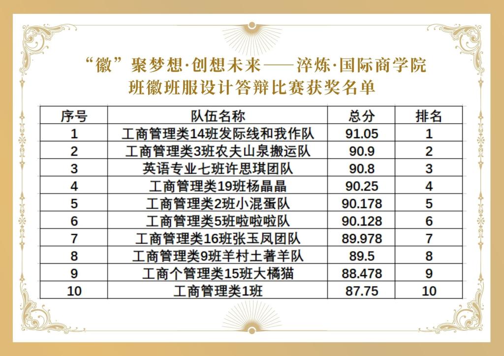 淬炼·国际商学院科技协会从2022年11月22日启动班徽班服设计大赛报名,期间累计报名队伍37个,总报名人数145人,收到班徽班服作品58份。到2023年3月17日决赛答辩结束,历时近四个月的淬炼·国际商学院班徽班服设计比赛落下帷幕。