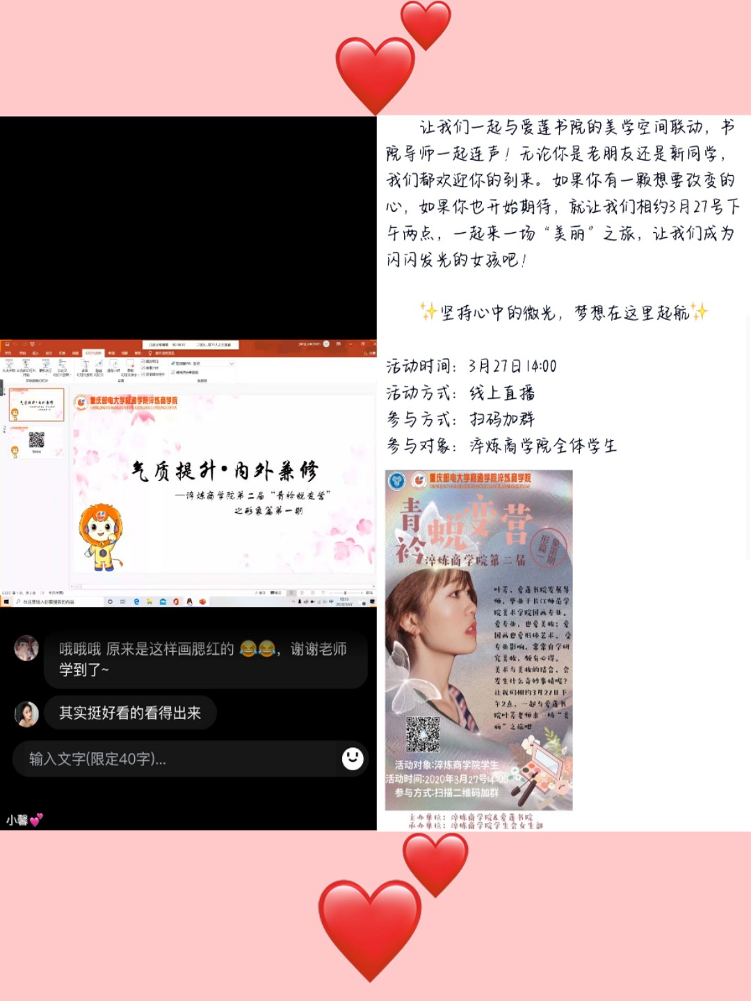 为了提升淬炼商学院各同学的形象气质,成为人群中闪闪发光的女孩,特此淬炼商学院学生会女生部联合爱莲书院,面向淬炼商学院全体学生于2020年3月27日下午两点在线上举办了的直播化妆活动。本次活动我们邀请到了毕业于长江师范学院美术学院国画专业的爱莲书院发展导师叶芳老师,与爱莲美学空间一起度过了这段美好时光。