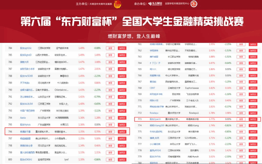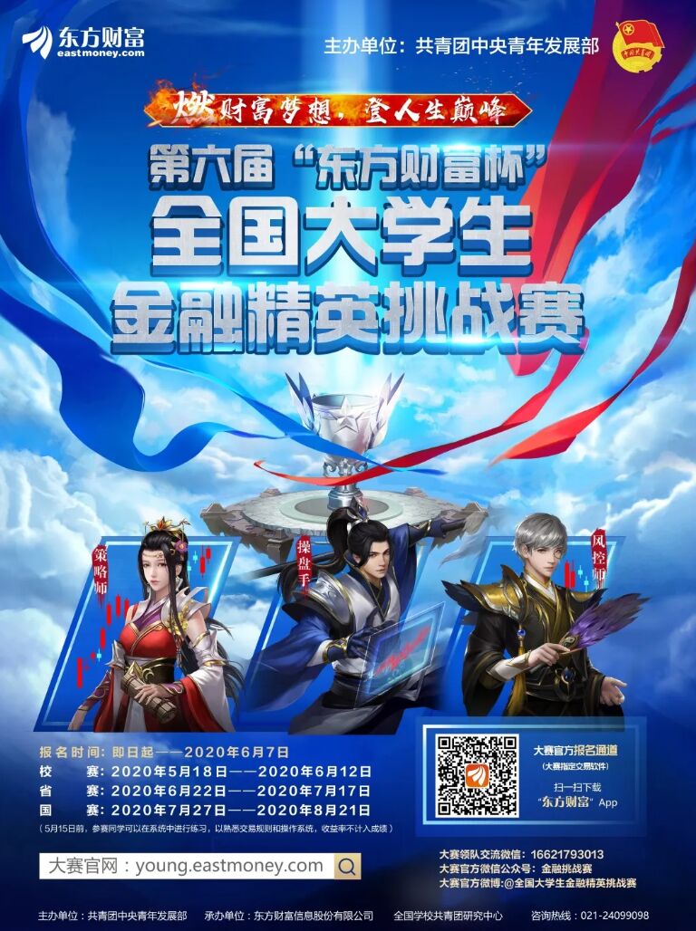 金融股海,如风雨行舟,东方财富杯全国大学生金融精英挑战赛是由共青团中央牵头,为了加强对大学生的金融实践教育的一项全国性高校赛事。本届大赛以“燃财富梦想,登人生巅峰”为主题,自4月23日启动报名,共吸引全国2571所高校超30万名大学生参与其中,各项指标屡创新高。比赛通过东方财富APP进行线上模拟炒股。各参赛选手结合近期市场热点,洞悉股市行情,谨慎操盘逐鹿金融市场。8月21日,第六届“东方财富杯”全国大学生金融精英挑战赛国赛成功落幕,我校学子喜获佳绩。