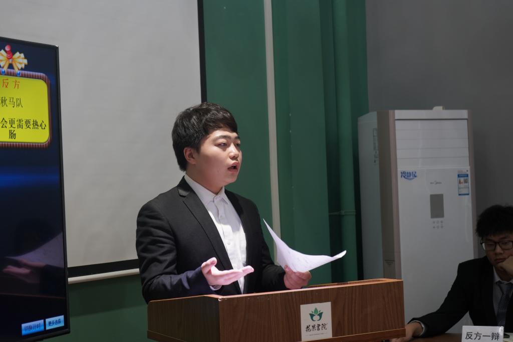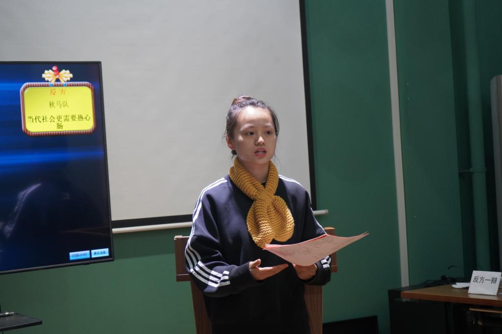 精于思美于言,秀于心慧于口。第一场是“秋马队”和“博弈队”的辩论。正方秋马队辩题为当代社会更需要冷头脑,以整个社会现状为背景,不断据理力争,论证己方观点。反方“博弈队”亦是妙语连珠,举生活实例进行有力回击,双方辩手在本场辩论赛中破题理论、旁征博引,展现出智与才的汇聚。