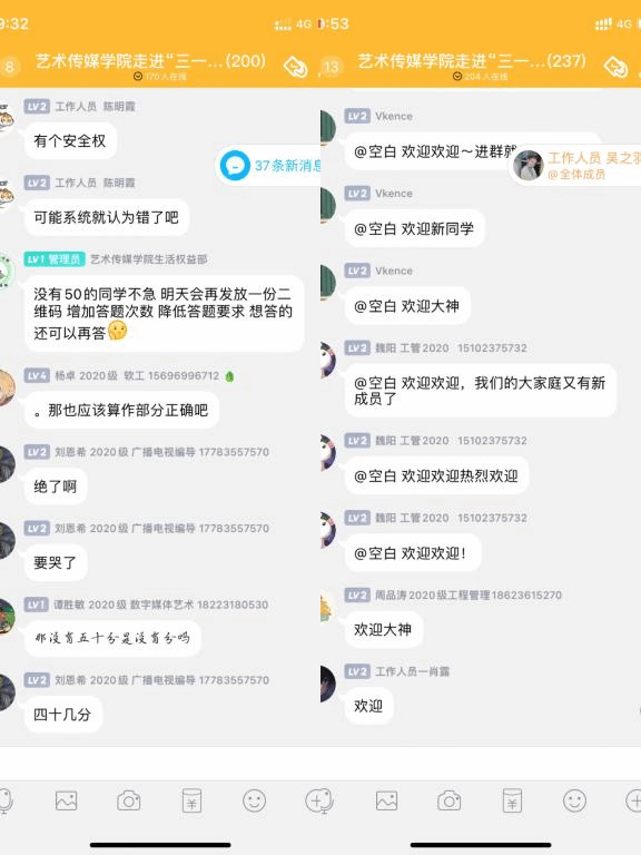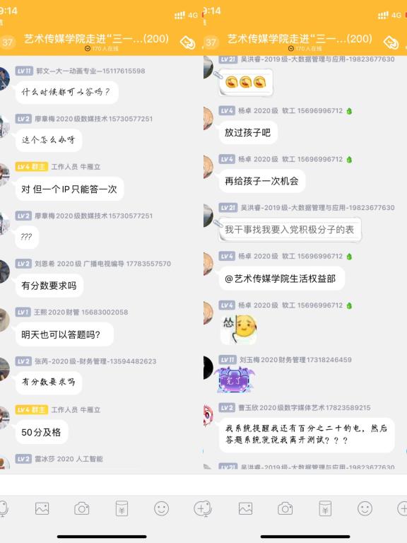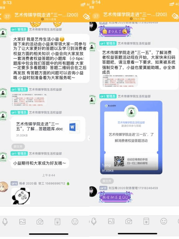 “三一五,了解消费者权益答题活动知识竞赛”采取线上参与扫码答题的形式,在25分钟里完成32道题,包括23道单选、5道多选、4道简答。当活动二维码发出后,同学们陆续地开始答题,随着答题人数的增加,活动日趋激烈,激发同学们的参与性。在答题的十几分钟里,大家近距离体会到维护消费者合法权益的各种途径以及必要性。
