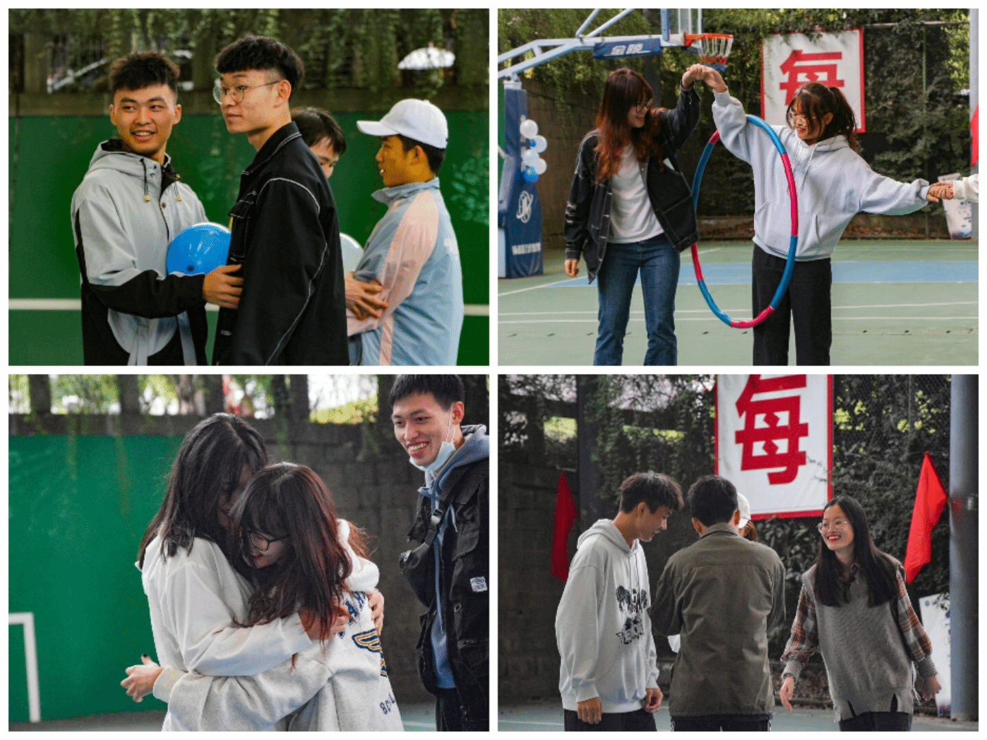 竞技场上出英雄,九支由三个不同学院的小伙伴组成的队伍将轮流进行pk与挑战。活动的趣味性让每一位队员无不尽笑颜开,在鲤跃龙门游戏中,转动的呼啦圈和队员们融为一体,犹如一条长龙一般,忽上忽下,穿梭在同学之间,就好像一条线将同学们连接了起来。在爱的抱“爆”游戏中,每个参与的同学都热血沸腾,激情四溢,响亮的气球爆炸声响彻整个风雨篮球场,赛场上同学们的欢笑声是此次活动最大的亮点,因为不仅代表着活动的趣味性,更是同学们青春洋溢的标志。作为团队的一份子,为团队贡献自己的力量,这才是破冰活动为大家带来的最重要的体验。