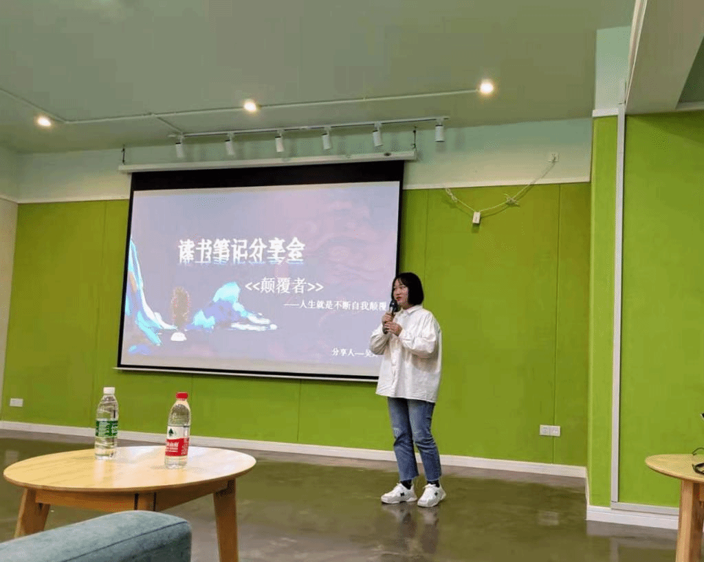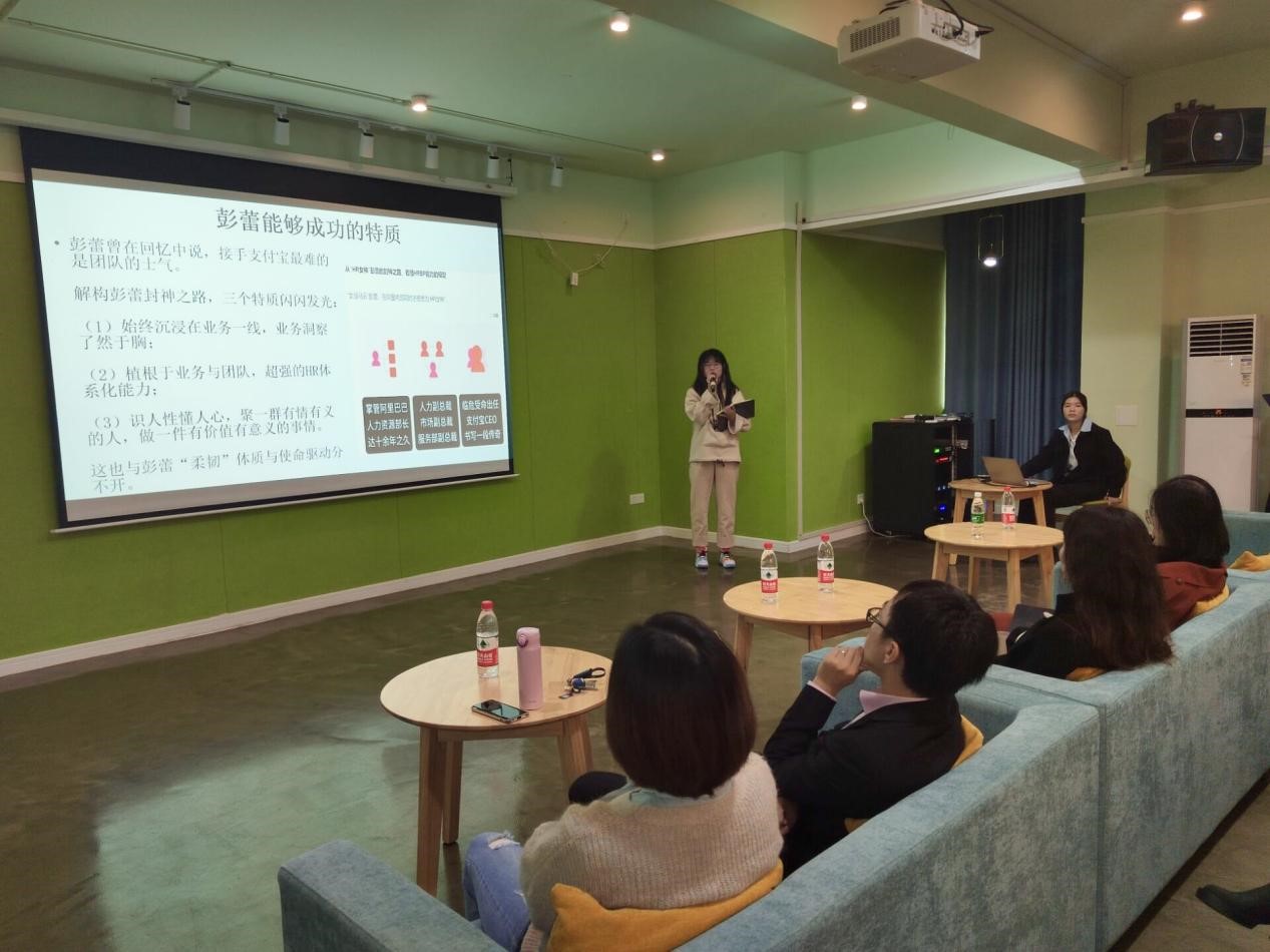 在听完老师们的精彩分享与读书建议后,同学们感悟颇多,也迫不及待分享了自己的读书感悟。孔雨欣同学分享的《彭蕾传》,她讲到彭蕾女士坚定的内心和杰出的领导力,用女性独有的温暖和洞察,让一个支付工具充满爱、信任和责任感。吴烨同学则对《颠覆者》进行了分享,她讲到“颠覆”二字,是书的主要核心,并激励同学们要颠覆自我,超越阶层出身,超越周边环境,超越性格局限。